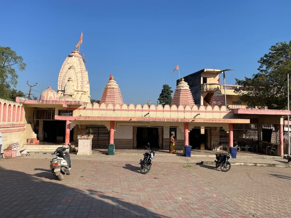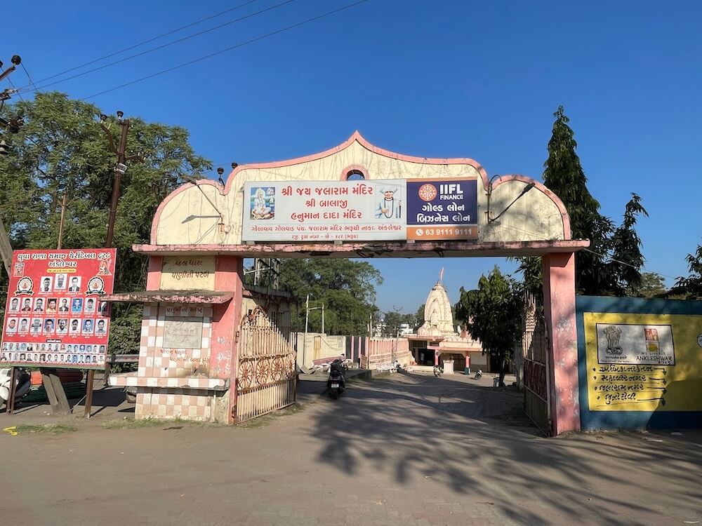The Jalaram Bapa Temple at Bharuchi Naka in Ankleshwar is set within a spacious precinct. Located slightly below the highway level, the temple complex is enclosed by a high boundary wall with a grand entrance arch. A short walk from the gateway leads to the imposing main temple. The structure bears four shikhars (spires), three of smaller size and one tall urushringa type spire. To the extreme left stands a small temple of Narmadeshwar Mahadev.