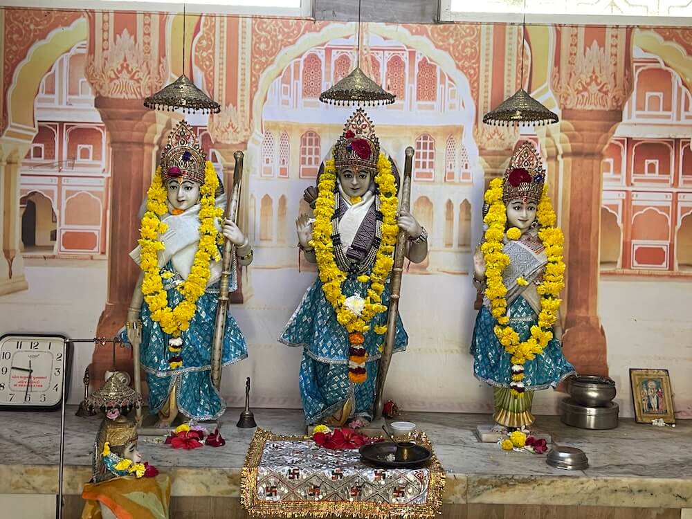 To the right of this sanctum is the shrine of Shri Ram, the deity Jalaram Bapa most adored. Here, upon a lofty marble pedestal, are the graceful idols of Shri Ram, Lakshman, Sita and Hanuman. In addition to these, there is also a shrine of Trimukhi Dattatreya.