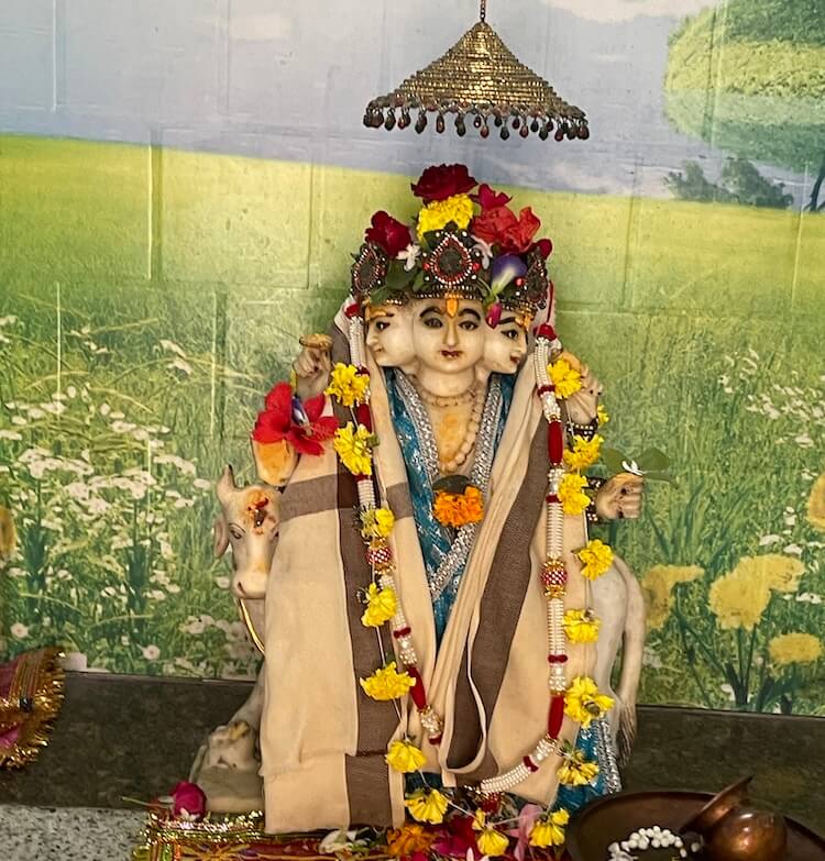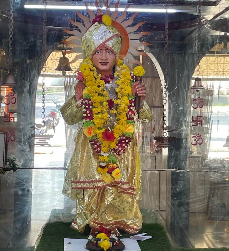 In the neighbouring sanctum, on an elevated marble platform, is the standing idol of Saint Jalaram Bapa, adorned in resplendent garments,