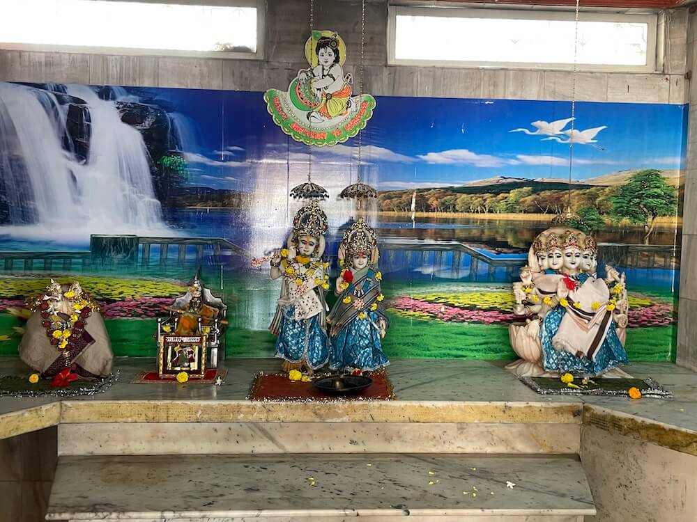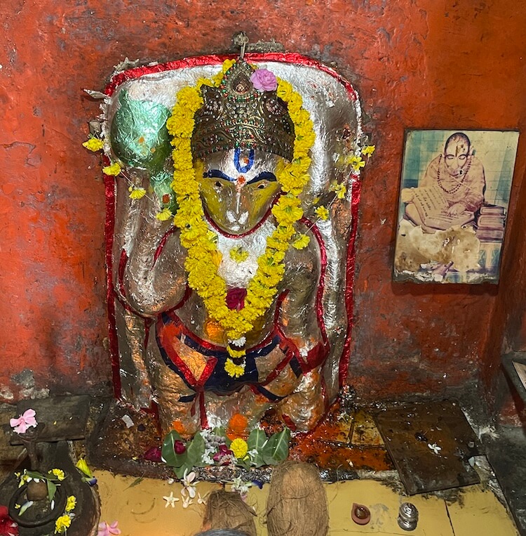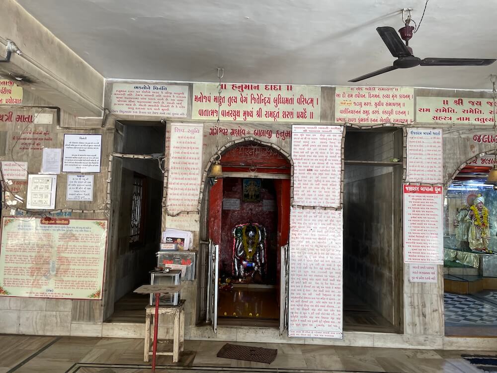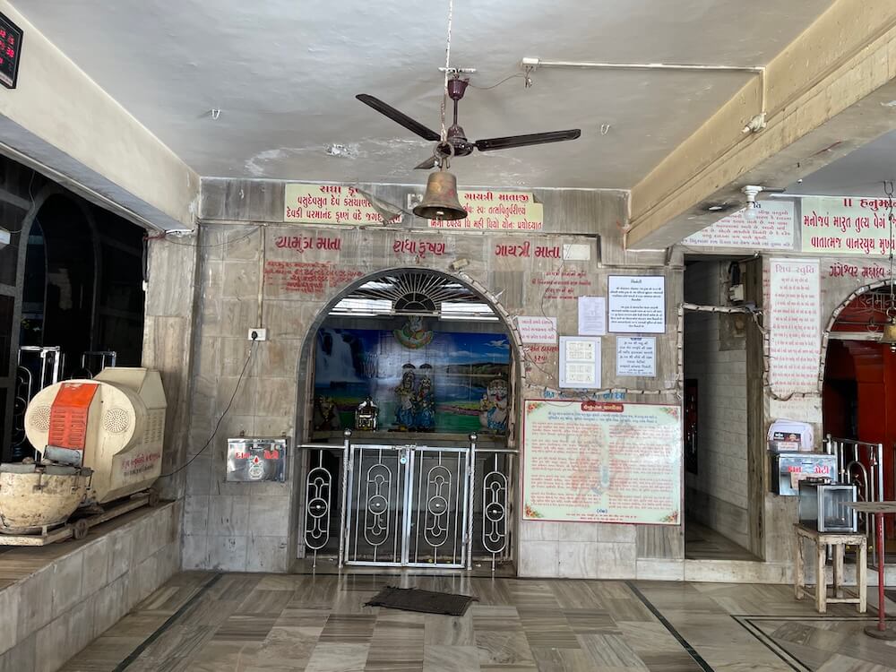 Within, there are four Garbhagrihas. In the leftmost sanctum, upon a high pedestal, are idols of Chamunda Mata, Radha-Krishna and Panchamukhi Gayatri Mata. In the next sanctum stands a stone idol of Balaji Hanuman.