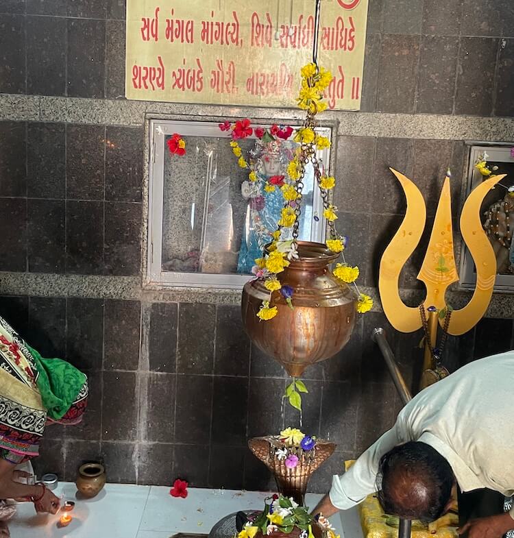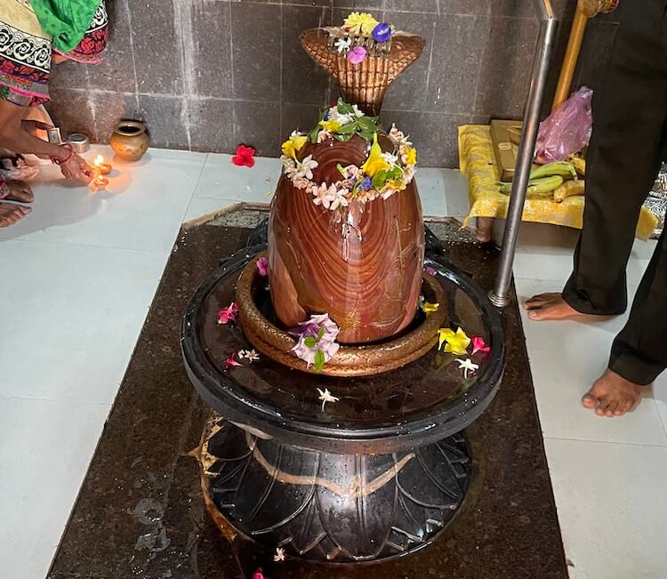 Upon it rises a tall cylindrical Shivalinga of shaligram, sheltered by a brass serpent hood. Above the pindi is a brass vessel for abhishek and a large trident is placed beside it.
