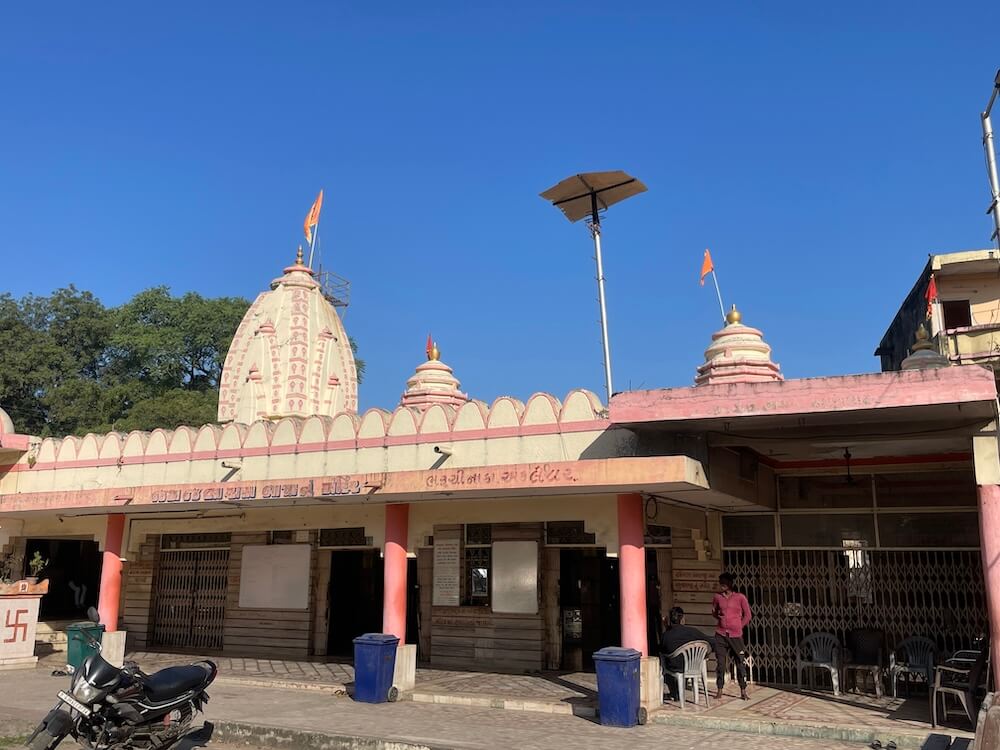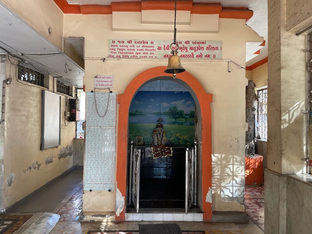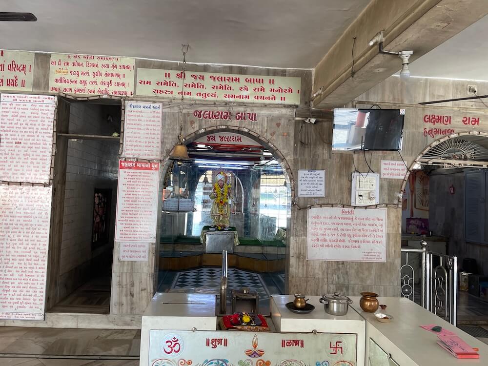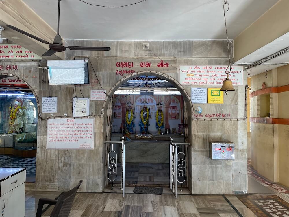 Adjoining this shrine stands the Jalaram Bapa Temple. Its design includes a long ovari (verandah), a Sabhamandap and multiple sanctums. Outside the ovari is a large Tulsi Vrindavan. The Sabhamandap has three grand entrances.