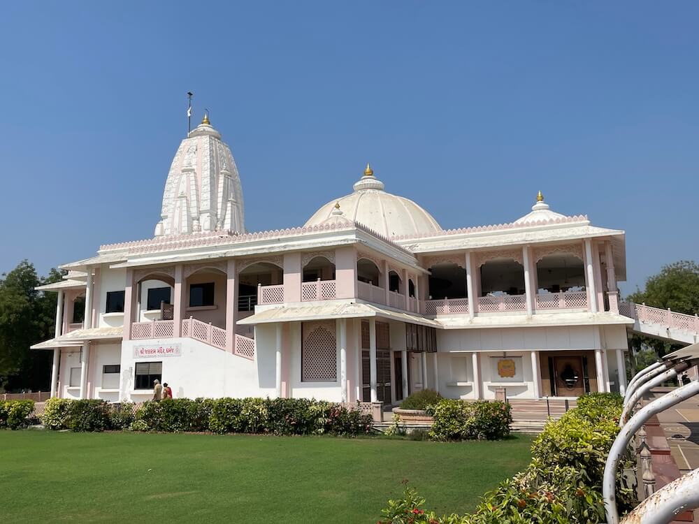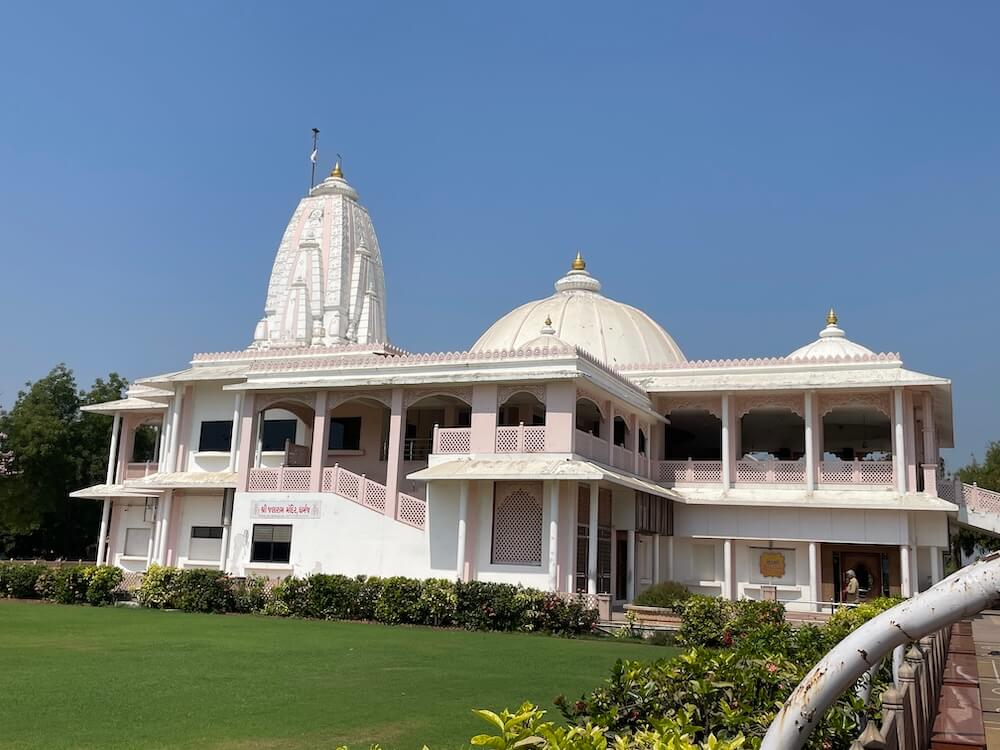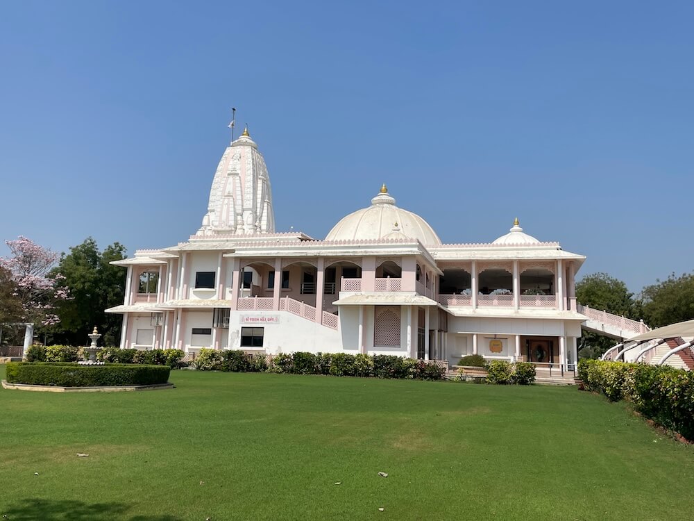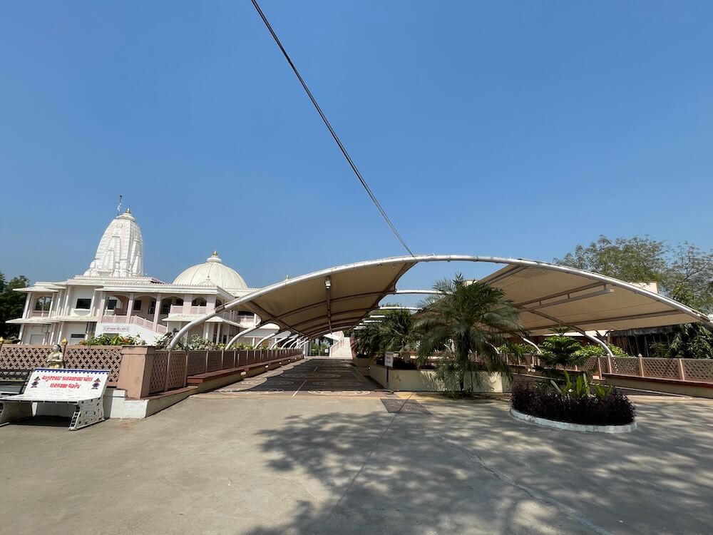 The grand temple at Dharmaj was established in 1978. It is an important shrine within the ‘Charotar’ region, a fertile tract comprising the districts of Anand and Kheda. The temple is administered through the ‘Shri Jalaram Satsang Mandal’ and the ‘Shri Jalaram Janseva Trust’. Dharmaj village is situated on the Tarapur–Vasad national highway. As travellers proceed along the highway, they first notice a large image of Jalaram Bappa standing near the principal entrance gateway of the temple. Passing through this gateway, one enters the spacious courtyard of the temple complex.