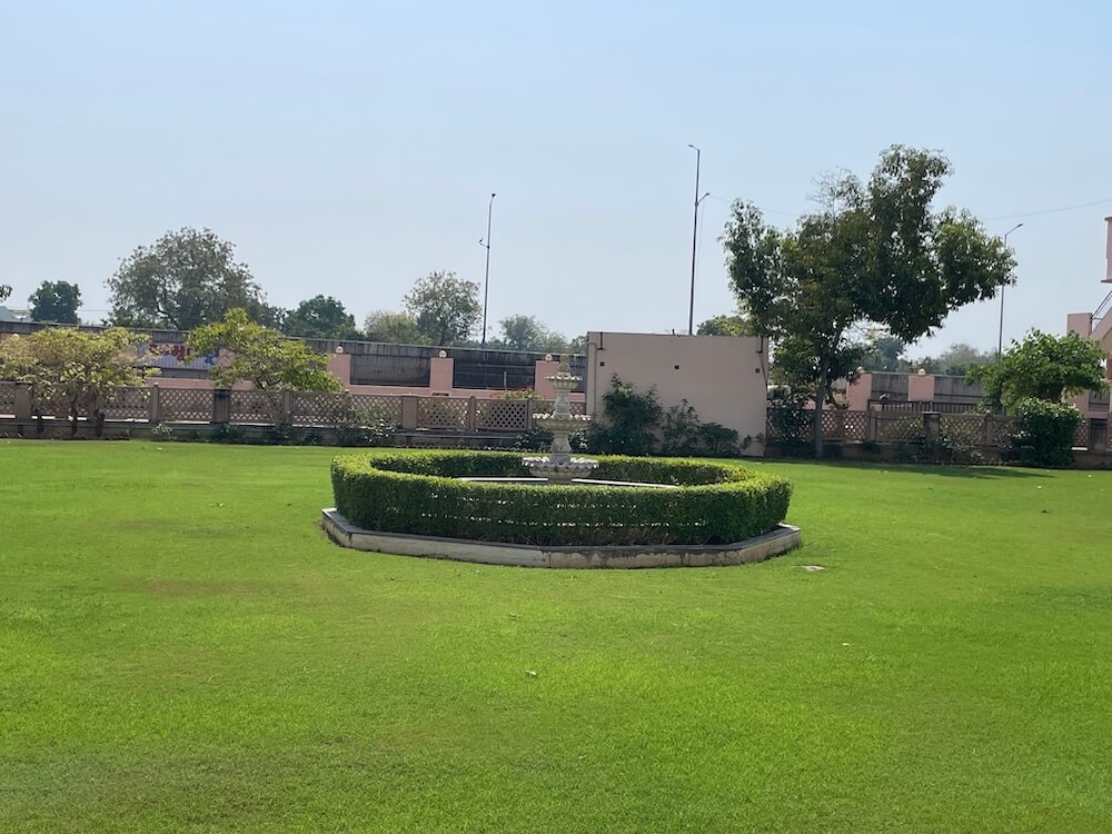 The pathway leading from this courtyard towards the temple is covered with a roof shaped in the form of a ‘gajprishtha’ (an architectural form resembling the curved back of an elephant). Both sides of the path are beautified with a variety of flowering plants. To the left of this pathway lies a well-maintained lawn at the centre of which stands a fountain. The boundary wall of this garden is adorned with sculpted figures drawn from mythology along with delicate ornamental carvings. Spacious rest houses have been provided here for the convenience of visiting devotees.