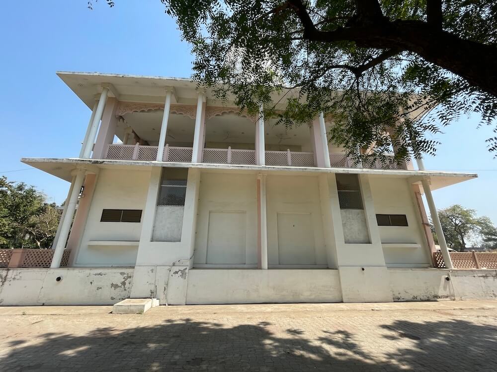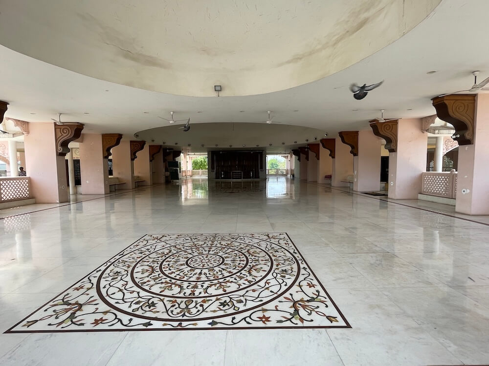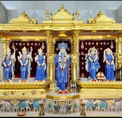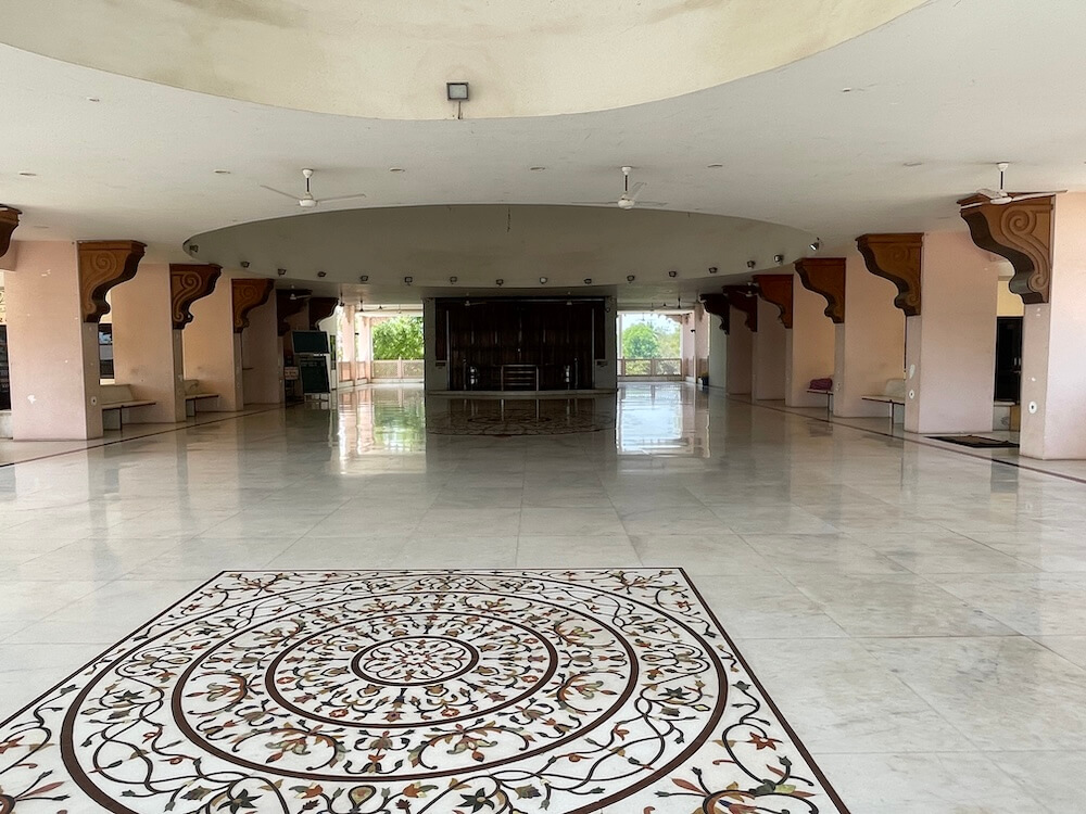 At the entrance of the sabhamandap stand sculpted figures of dwarpals (guardian sentinels) on either side. The hall itself is spacious, with projecting balconies along both sides. Its interior ceiling rises in a graceful dome. Beyond the sabhamandap, leaving a pradakshina path (circumambulatory passage), the structure leads to the garbhagriha (sanctum). Within the sanctum, upon a vajrapith (sacred pedestal), stands the upright idol of Jalaram Bappa. Upon Bappa’s head rests the traditional turban and in his hand, he holds a tulsi mala (rosary made from holy basil beads). To the left of the principal idol are the images of Shri Ram, Sita and Lakshman, while on the right stand the idols of Radha and Krishna. Along with the main temple,