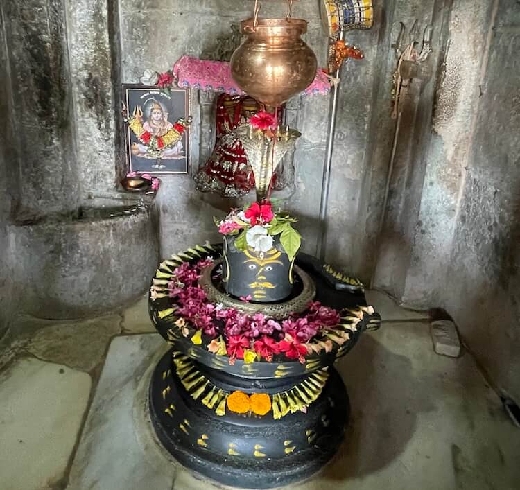 Its design and ornamentation bear a striking resemblance to the ‘Vandanmalika’ pattern seen in the famous Rudra Mahalaya Temple at Siddhpur. The hall and its pillars are replete with carvings and celestial sculptures. At the base of these columns, one finds depictions of mythological scenes, ‘Kirtimukhas’ (glory masks) and ‘Makara’ (mythical sea-creatures), topped with ‘Ghat-Pallav’ (pot and foliage) designs. The weight of these pillars is metaphorically borne by sculpted ‘Bharavahaka Yakshas’. The ceiling is a tapestry of lotus motifs and dancing ‘Sursundaris’ (celestial beauties). Within the assembly hall, a statue of Nandi sits facing the sanctum. The doorposts and lintel of the sanctum sanctorum are similarly adorned with carvings, featuring ‘Kirtimukhas’ at the base and representations of the holy rivers Ganga and Yamuna. Lord Ganesha occupies the central ‘Lalatabimba’ (auspicious point) on the doorframe. The sanctum houses a large Shivalinga upon an elevated ‘Shalunka’ (pedestal), with Mother Parvati enshrined in a niche on the rear wall.