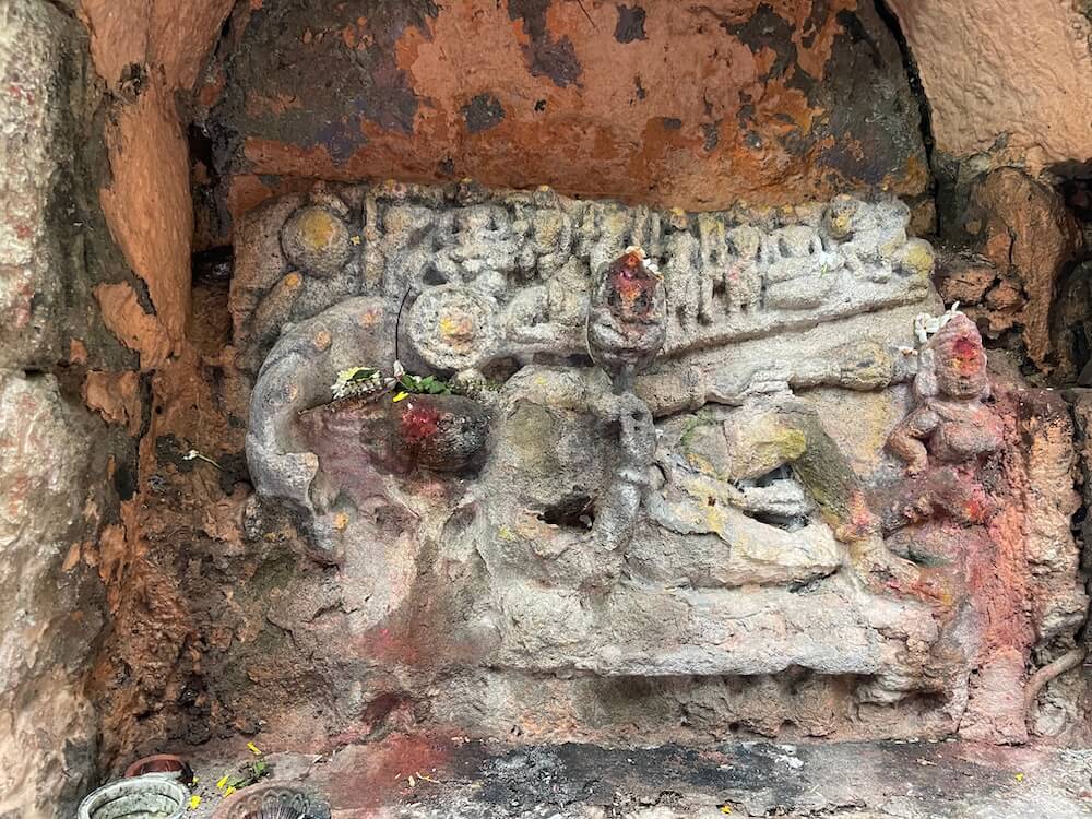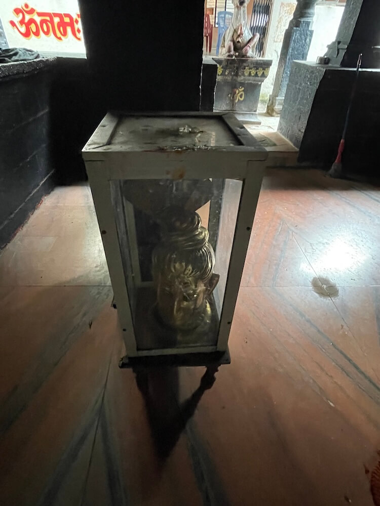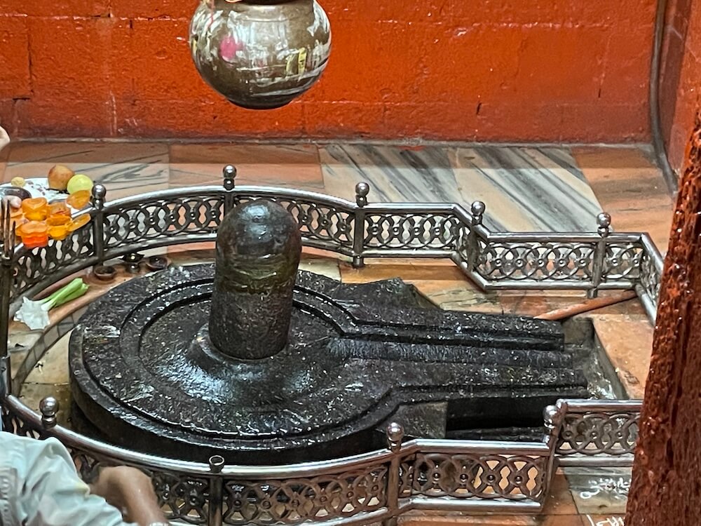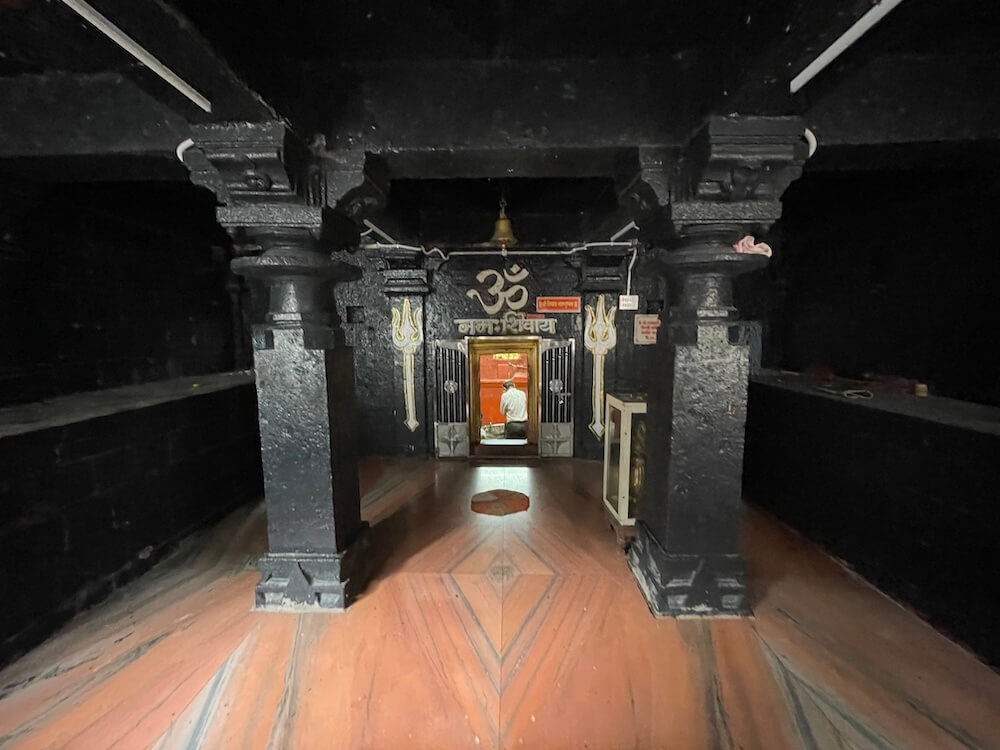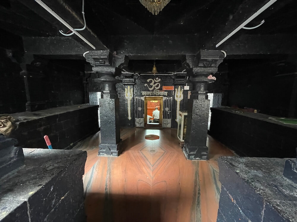 गर्भगृहात जमिनीवर मध्यभागी शिवपिंडी आहे. शिवपिंडीवर छत्र धरलेला पितळी नाग आणि जलधारा धरलेले तांब्याचे अभिषेक पात्र छताला टांगलेले आहे. बाजूला पितळी त्रिशूल आहे. येथे शिवपिंडीभोवती सुमारे सहा इंच उंच धातूचा नक्षीदार कठडा आहे.