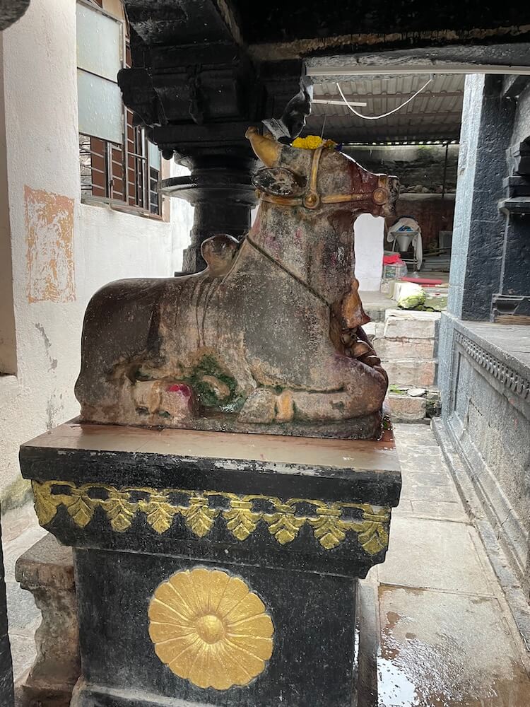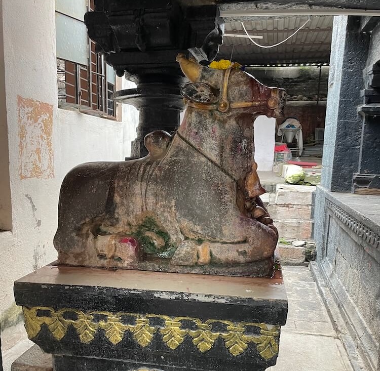 मुखमंडप, सभामंडप व गर्भगृह अशी मंदिराची संरचना आहे. मुखमंडपात पुढील बाजूस दोन नक्षीदार स्तंभ आहेत. स्तंभपादावर उभ्या स्तंभांचा खालील सुमारे पाच फूट भाग चौकोनी आहे, तर वरील दोन फूट भाग षटकोन, अष्टकोन, वर्तुळ अशा विविध भौमितिक आकारात आहे. स्तंभांच्या शीर्षभागी कणी, तर त्यावर हस्त आहेत. हस्तांवर चारही बाजूंना नागशिल्पे व पशू शिल्पे कोरली आहेत. मुखमंडपात वज्रपीठावर नंदीची काळ्या पाषाणातील मूर्ती विराजमान आहे. वज्रपीठावर चारही बाजूला चक्रनक्षी कोरली आहे. तसेच त्यावर पर्णलता, पुष्पलता नक्षी दिसून येते. नंदीच्या पाठीवरील झुल, वशिंड, शेपटी अत्यंत बारीक तपशिलासह कोरली आहे. त्यातून शिल्पकारांचे कौशल्य अधोरेखित होते.