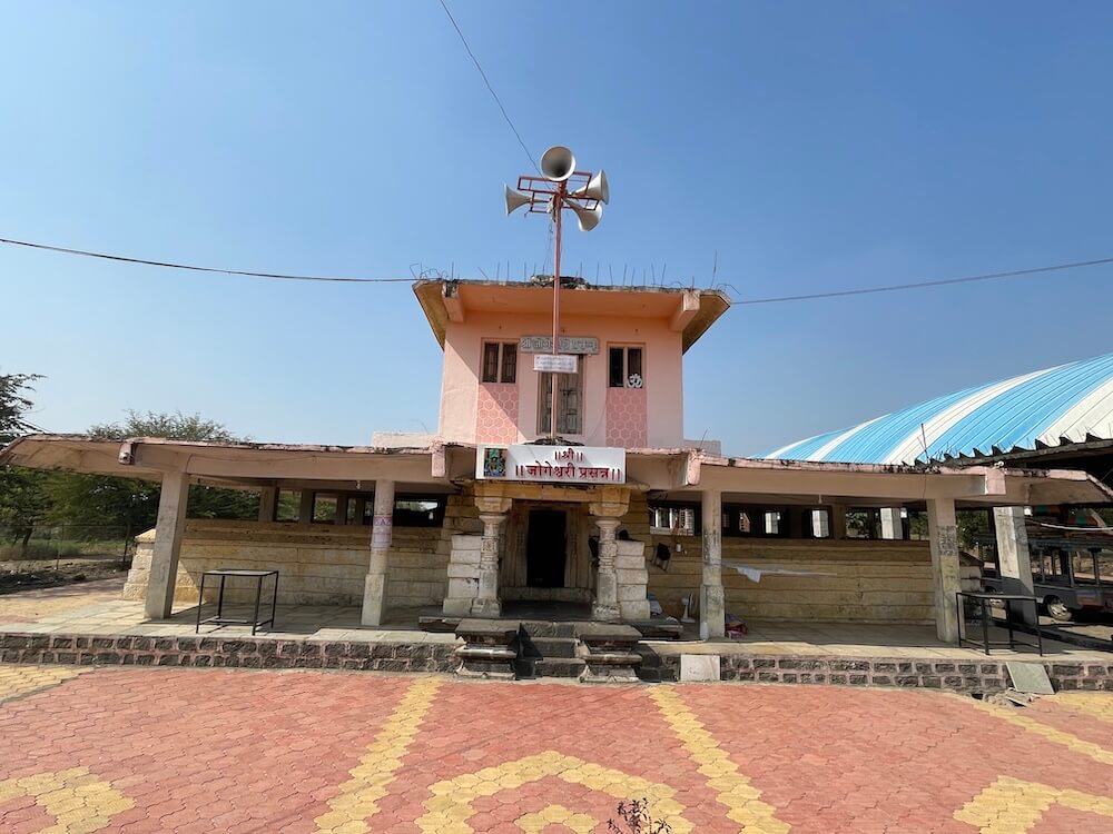 रस्त्यालगत असलेल्या जोगेश्वरी मंदिराच्या पेव्हर-ब्लॉक आच्छादित प्रशस्त प्रांगणात प्रवेशद्वाराच्या दोन्ही बाजूंना पाषाणी बांधणीचे चौथरे आहेत. त्यावर गोलाकार दीपमाळा आहेत. प्रांगणात भाविकांना बसण्यासाठी आसने आहेत, तसेच मंदिरासमोर एक चौथरा दिसतो. या चौथऱ्यावर चार नक्षीदार स्तंभ आहेत. या स्तंभांच्या मध्ये शिवपिंडी आहे. या शिवपिंडीत चौकोनी शाळुंकेवर मध्यभागी वर्तुळ आहे आणि त्या वर्तुळावर चार लिंगपाषाण आहेत. चौकोनी शाळुंकेच्या चार कोपऱ्यांपैकी दोन कोपऱ्यांत पशुमुखे आहेत. या पशूंची जीभ मुखाबाहेर आलेली दाखवली आहे. दुसऱ्या दोन कोपऱ्यांत नरमुखे आहेत. प्राचीन काळात ही जागा बळीवेदी असावी, असा अंदाज पुरातत्वप्रेमींकडून व्यक्त केला जातो. या चौथऱ्यापुढे तुळशीवृंदावन आहे आणि त्यापुढे पाषाणी स्तंभावर शिवपिंडी आहे.