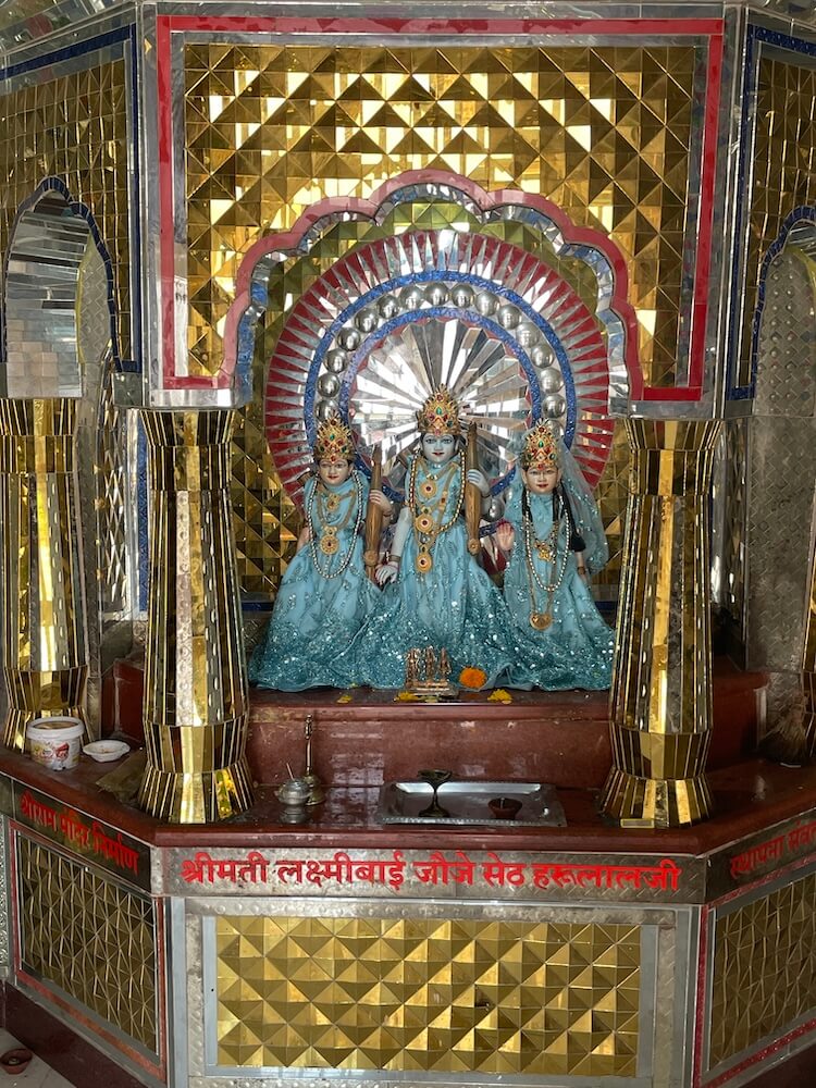 Gilded in golden hues, this idol appears as high-relief sculpture. Next to it is the Ram temple, where a tall stone frame decorated with glass holds the marble idols of Lord Ram, Sita and Lakshman, adorned in garments and ornaments. The spire of this temple is also distinctively designed.