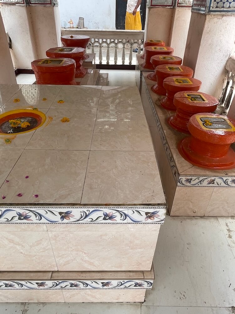 Nearby stands a samadhi temple decorated with glass, where on a large marble platform sacred footprints (padukas) are placed. Near it are eleven carved stone slabs, round and hexagonal in shape, each also bearing sacred footprints. These are the samadhis of saints and holy men of the Udasi tradition.