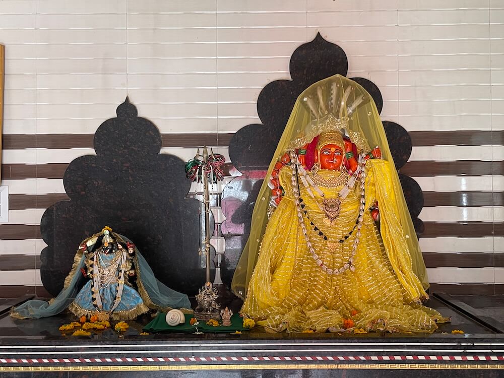On the right side of the glass temples lies the shrine of Saptashrungi Mata. A large idol of the goddess, richly clothed and bejeweled, rests upon a marble pedestal. She wears a crown, shaded by the hood of a five-headed serpent. Beside her, a smaller idol of the goddess carved from black stone is installed.