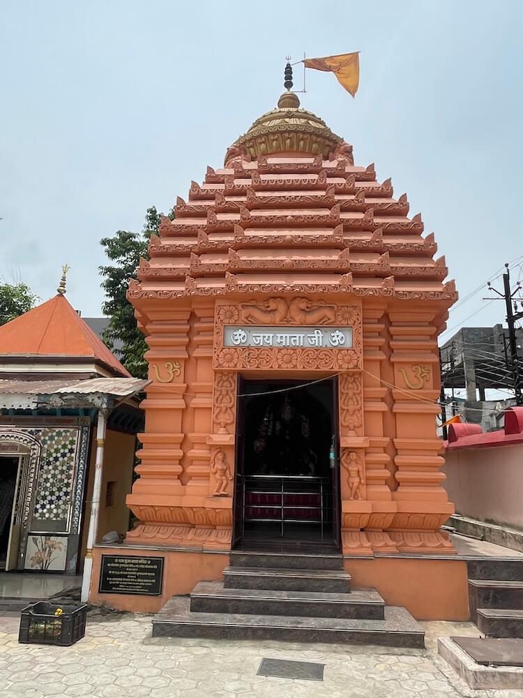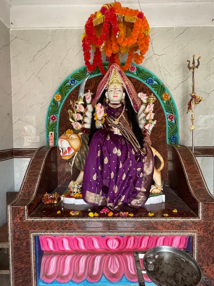 To the left of these glass temples stands the grand shrine of Dashbhuja Mata in her Chandraghanta form. Inspired by Purandas Maharaj, this temple was consecrated on February 22, 2024. Built upon a tall platform using red stone, the temple walls resemble a cluster of pillars joined together. The spire, pyramidal in form, rises above, crowned with a two-tiered amalaka and a pinnacle. At the entrance, carvings of gatekeepers adorn the doorway, while lions, the goddess’s mount, are sculpted above the lintel. Inside, at the center, on a marble pedestal, is enshrined the idol of Dashbhuja Mata, beautifully adorned with ornaments and garments. The goddess, seated on a lion, holds various weapons, as well as a conch, a flower and a bell, with one hand raised in blessing.