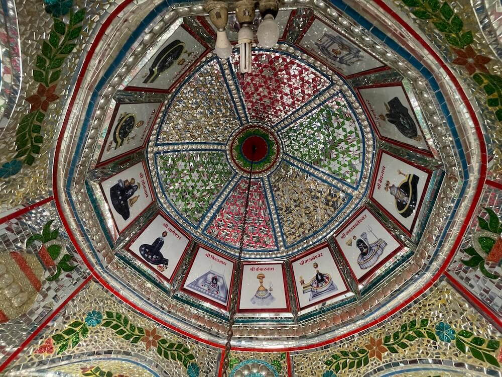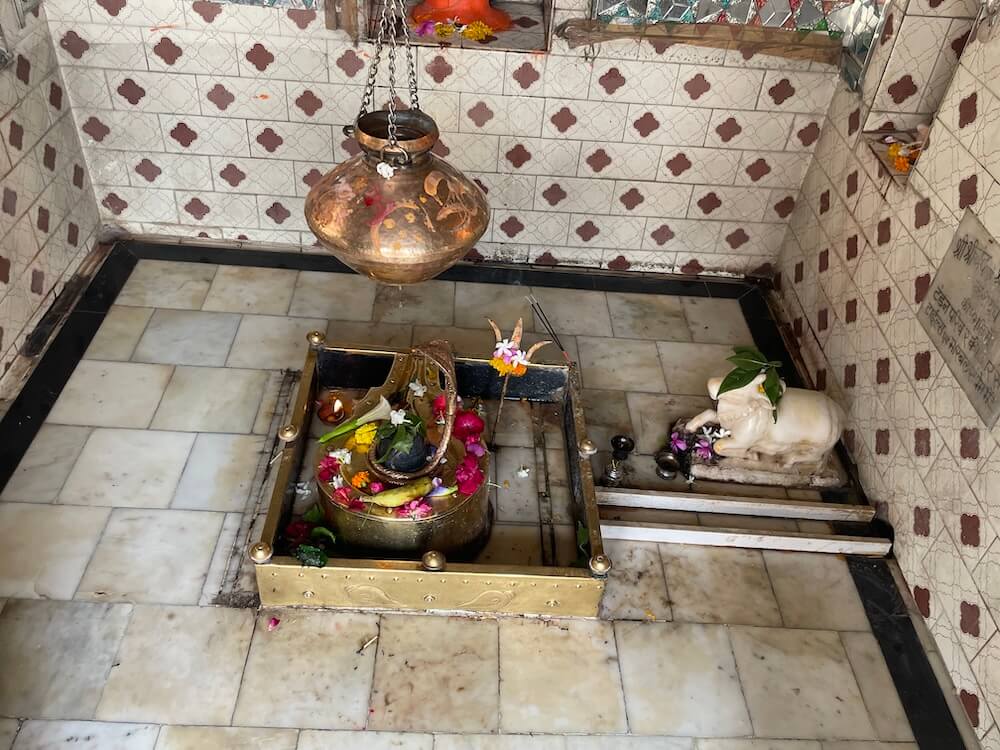 On entering through the simple gateway of the courtyard, to the left, one finds three glass temples and one samadhi decorated with glasswork. The unique feature of these Kaanch Mandirs is the intricate artwork crafted from multicolored glass, both inside and outside the walls. It is said that these glass pieces were imported from Belgium. The first Kaanch Mandir is dedicated to Lord Shiva, who holds a special place in the Udasi sect. In the sanctum lies a Shiva lingam, installed in a square altar, with its shaalunka clad in brass. Remarkably, the face of this shaalunka is turned toward the back wall of the sanctum, with a small marble idol of Nandi placed on its left. Unlike most Shiva temples, where Parvati’s idol is also present, here instead one finds a rough stone idol of Hanuman. The temple tower rises in a pyramidal form above the shrine.