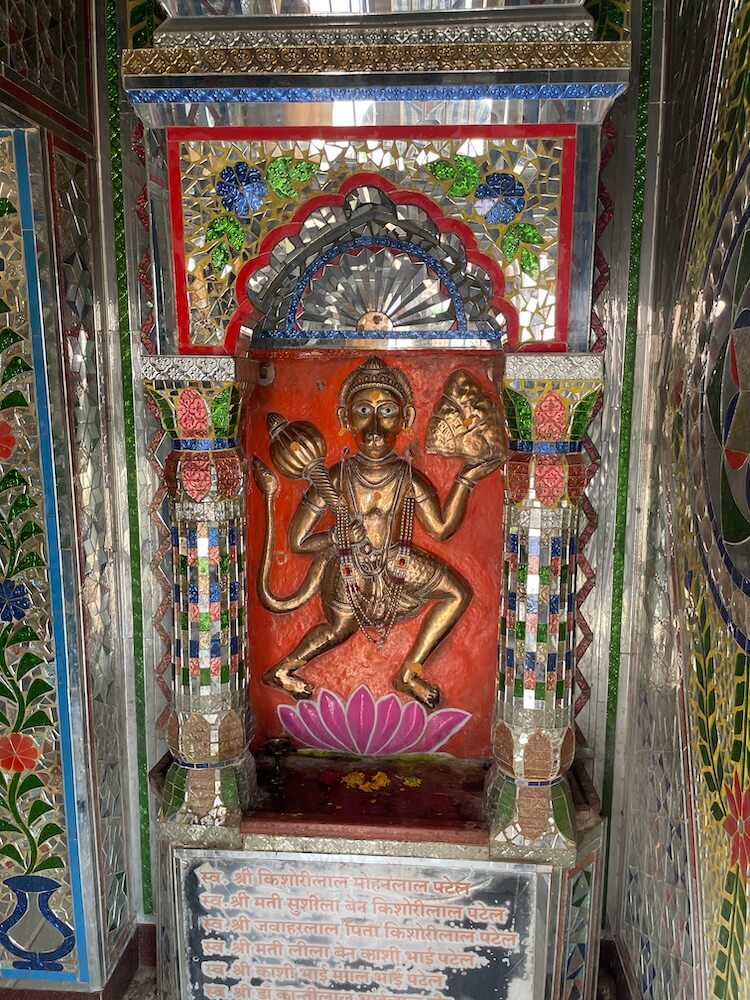 Adjacent to the Shiva temple stands the Hanuman temple, its spire dome-shaped. Within, in a glass-adorned stone shrine, rests an idol of Hanuman carrying the Dronagiri mountain.