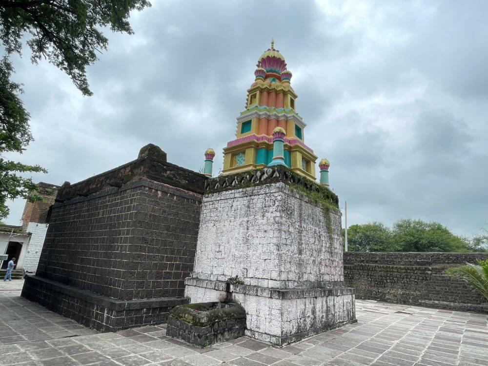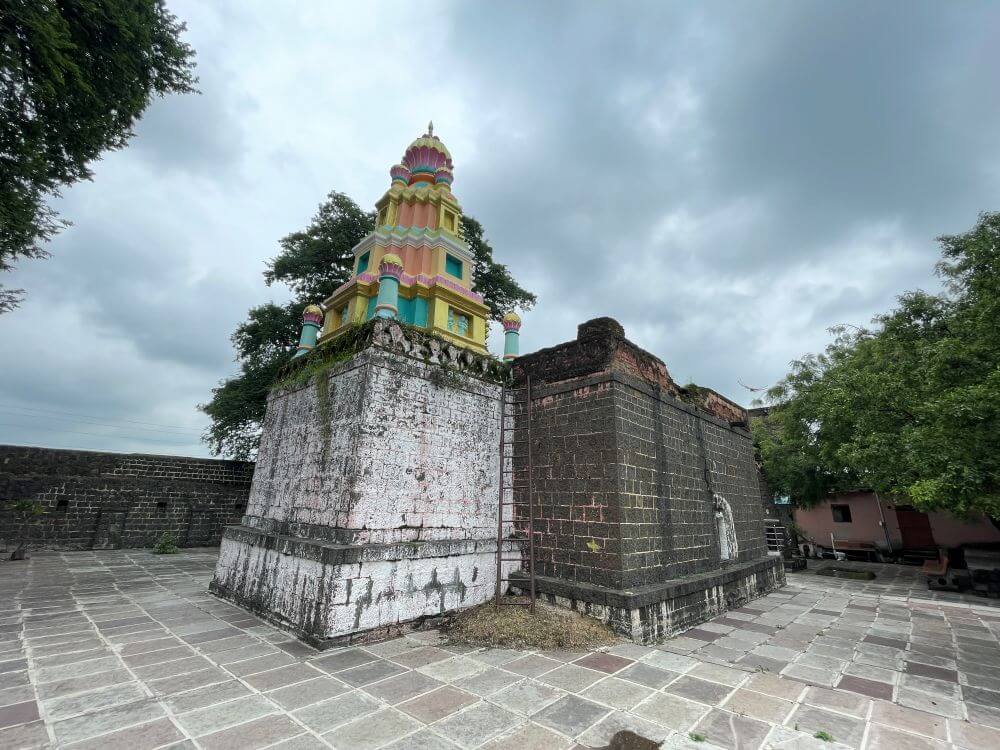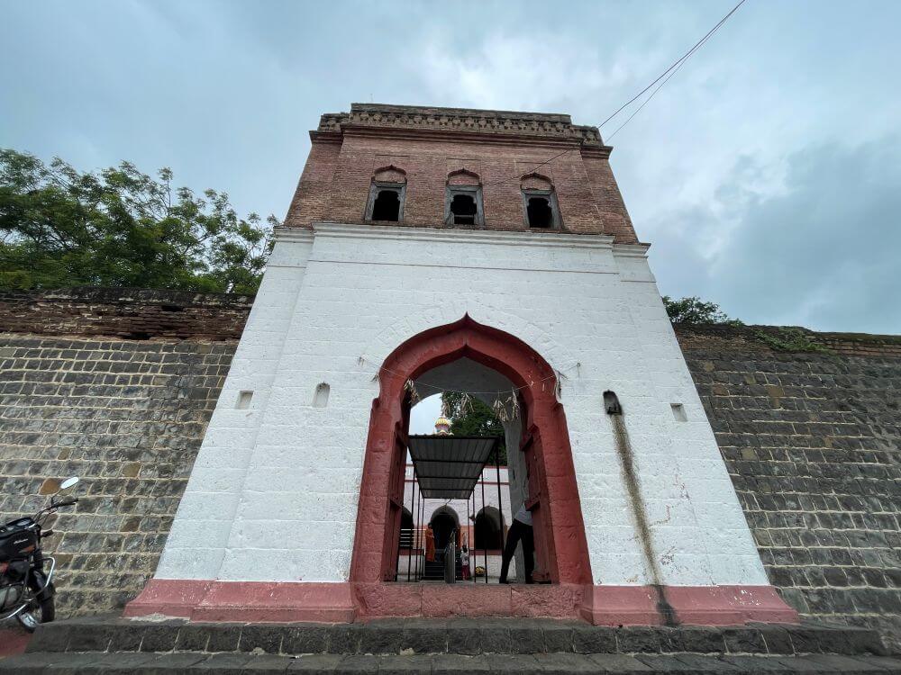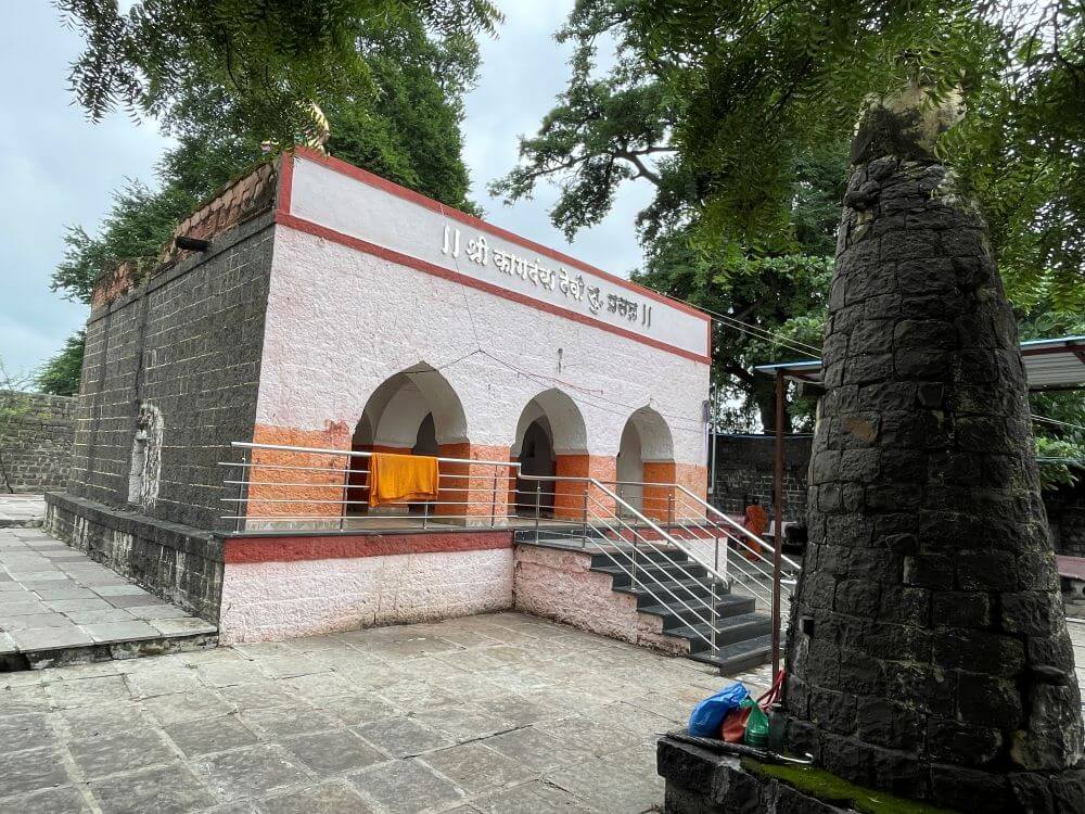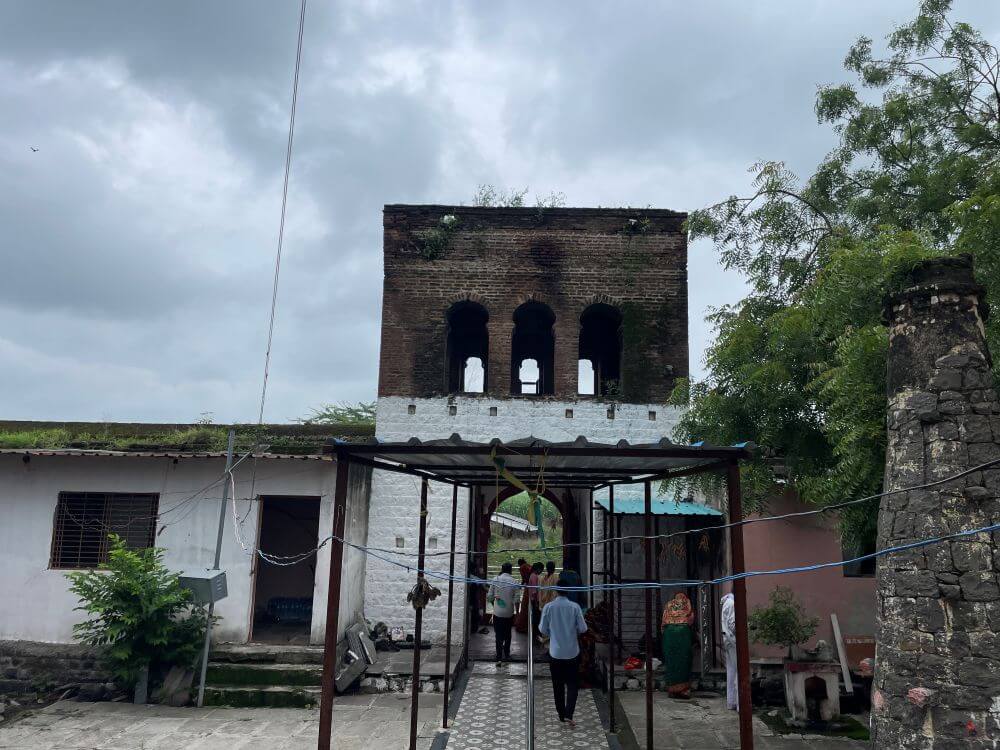 गावापासून काही अंतरावर असलेल्या या मंदिरापर्यंत पक्का रस्ता आहे. मंदिराच्या सामोर कल्लोळ कुंड आहे. या कोरीव पाषाणात बांधलेल्या कुंडात उतरण्यासाठी पायऱ्या आहेत. असे सांगितले जाते की या कुंडातील पाणी कधीही आटत नाही. येथे शुचिर्भूत होऊन मंदिरात दर्शनाला जाण्याची प्रथा आहे. मंदिराभोवती सुमारे पंधरा फूट उंचीची भक्कम तटबंदी आहे. या तटबंदीत दुमजली प्रवेशद्वार आहे. प्रवेशद्वाराच्या दोन्ही बाजूला तटबंदीच्या दर्शनी भिंतीत दीपकोष्टके आहेत. प्रवेशद्वारास नक्षीदार लाकडी झडपा व द्वारशाखांवर अस्पष्ट नक्षी आहे. प्रवेशद्वाराच्या आत दोन्ही बाजूला पहारेकरी कक्ष व वरील मजल्यावर नगारखाना आहे. नगारखान्यात जाण्यासाठी प्रवेशद्वाराच्या दोन्ही बाजूने पायऱ्या आहेत.