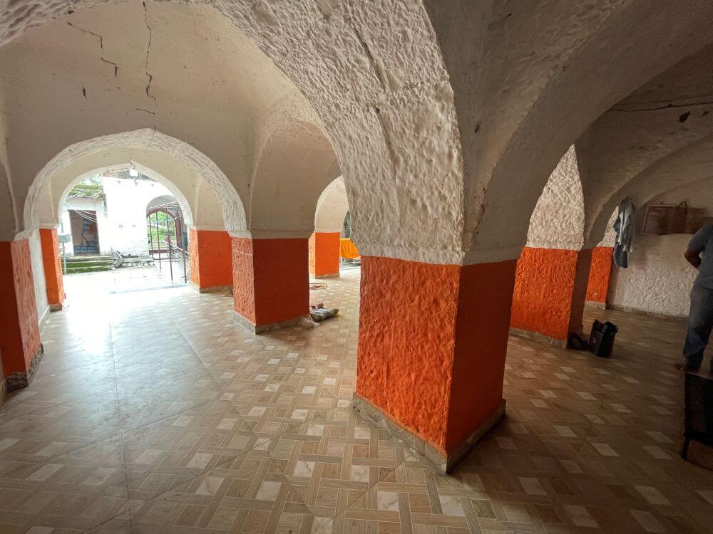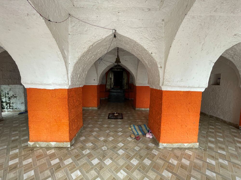 प्रवेशद्वारापासून सभामंडपापर्यंत फरशी आच्छादित पायवाट आहे. दगडी फरसबंदी प्रांगणात भाविकांना बसण्यासाठी आसने आहेत. मंदिरासमोर दोन्ही बाजूला दगडी बांधणीच्या प्राचीन गोलाकार दीपमाळा आहेत.