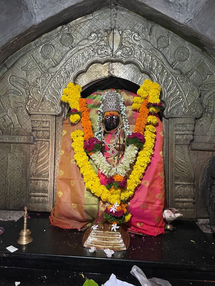 सभामंडपापेक्षा गर्भगृह उंचावर असल्यामुळे चार पायऱ्या चढून यावे लागते. गर्भगृहाच्या प्रवेशद्वाराच्या द्वारशाखांवर वेलबुट्टी नक्षी व स्तंभनक्षी आहे. प्रवेशद्वाराच्या लाकडी जाळीदार झडपा रजतपटल अच्छादित आहेत. गर्भगृहात वज्रपिठावर देवीची पाषाण मूर्ती आहे. देवीच्या मस्तकी चांदीचा मुकुट, चांदीचे डोळे, नाकात मोत्यांची नथ, अंगावर वस्त्रे व विविध अलंकार आहेत. मूर्तीसमोर पादुका आहेत. देवी मूर्तीच्या बाजूला देवीच्या शक्तीची काळ्या पाषाणातील मूर्ती आहे. वज्रपिठाच्या मागील प्रभावळीवर पानाफुलांची नक्षी आहे. गर्भगृहाच्या छतावर चारही कोनांवर चार वामनस्तंभ, त्यावर आमलक व कळस आहेत. छतावर चार थरांचे भूमीज शैलीतील शिखर आहे. खालील तीन थरात चारही बाजूंना देवकोष्टके व स्तंभनक्षी आहेत. चौथ्या थरात चारही बाजूंना लघूशिखरे व मध्यभागी आमलक आहे. आमलकावर कळस व ध्वजपताका आहे.
