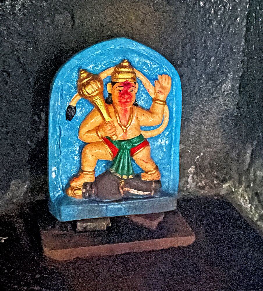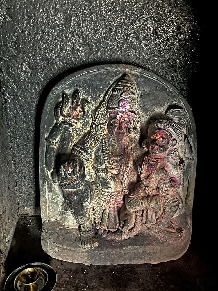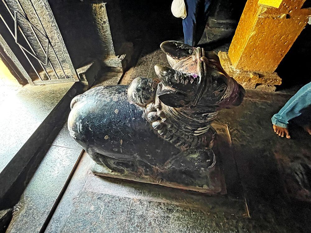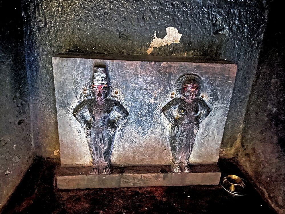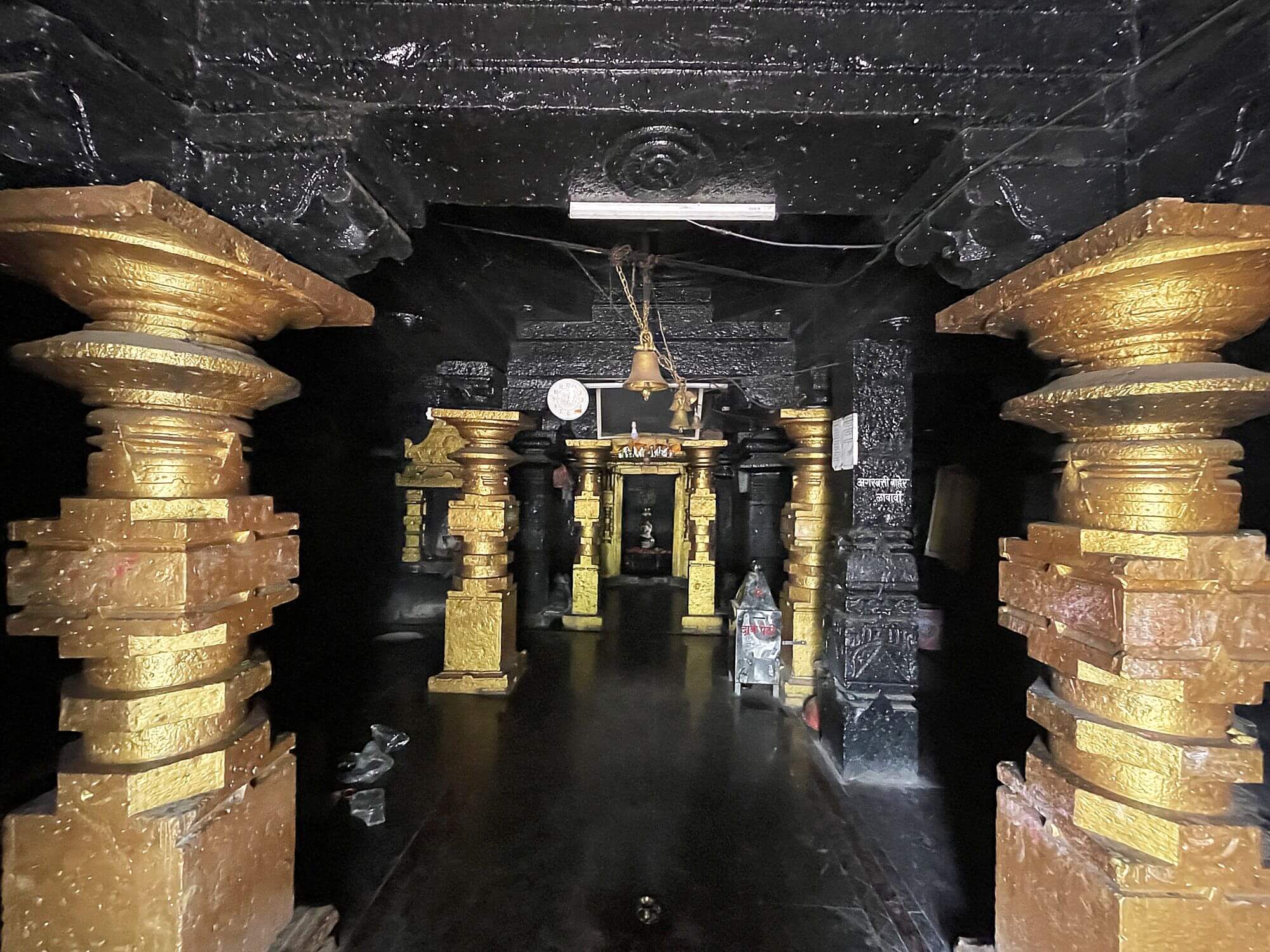 आतील बाजूला अखंड पाषाणातील नंदीची मूर्ती व त्यापुढे कासवमूर्ती आहे. सभामंडपातील कलाकुसर केलेल्या दगडी स्तंभांवर तुळया व त्यावर मंदिराचे छत आहे. येथील भिंतींवर असलेल्या देवकोष्टकांत विविध देवतांच्या मूर्ती आहेत. त्यामध्ये विठ्ठल–रुख्मिणी, गणपती आणि हनुमान या मूर्तींचा समावेश आहे. बारकाईने पाहिल्यास या मूर्तींवर नाजूक असे कोरीव काम दिसते. यापैकी एका देवकोष्टकात शिव आणि पार्वतीची सुंदर मूर्ती आहे. सहसा मंदिरात असलेल्या मूर्तींमध्ये महादेव जटाधारी रुपात असतात. पण काळ्या दगडात कोरलेल्या येथील शंकराच्या डोक्यावर मुकुट आहे. चतुर्भुज रुपातील या शंकराच्या एका हातात त्रिशुल आहे व दुसऱ्या हातात नाग आहे. एक हात आशिर्वादासाठी समोर आहे आणि दुसरा हात डावीकडे बसलेल्या पार्वतीच्या खांद्यावर आहे. येथून पुढे अंतराळात प्रवेश होतो. अंतराळात असलेल्या गर्भगृहाच्या द्वारशाखांवर नक्षीकाम आहे. ललाटबिंबाच्या वरील भागात देवतांच्या मूर्ती कोरलेल्या आहेत. गर्भगृहात जमिनीपासून वर शाळुंका असलेली कोरीव शिवपिंडी आहे. त्यावर पितळी नागाचा फणा आहे.