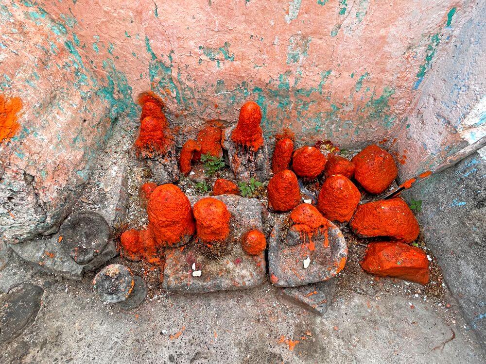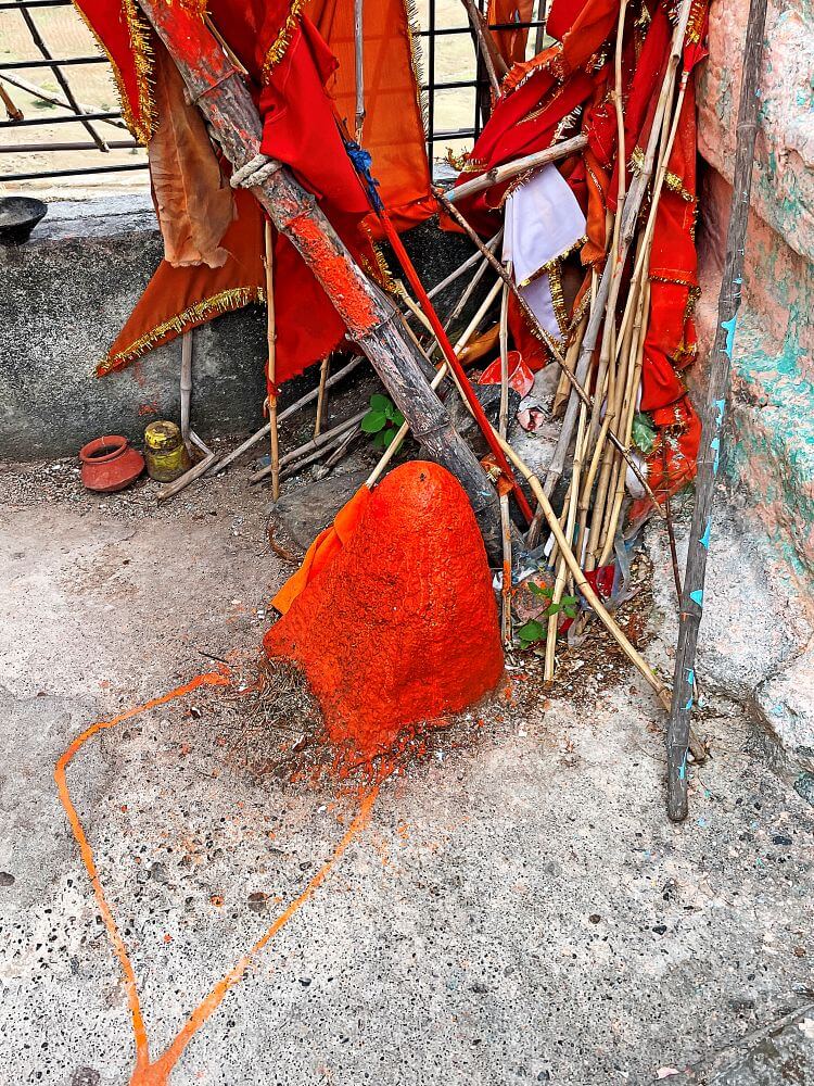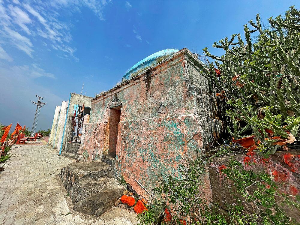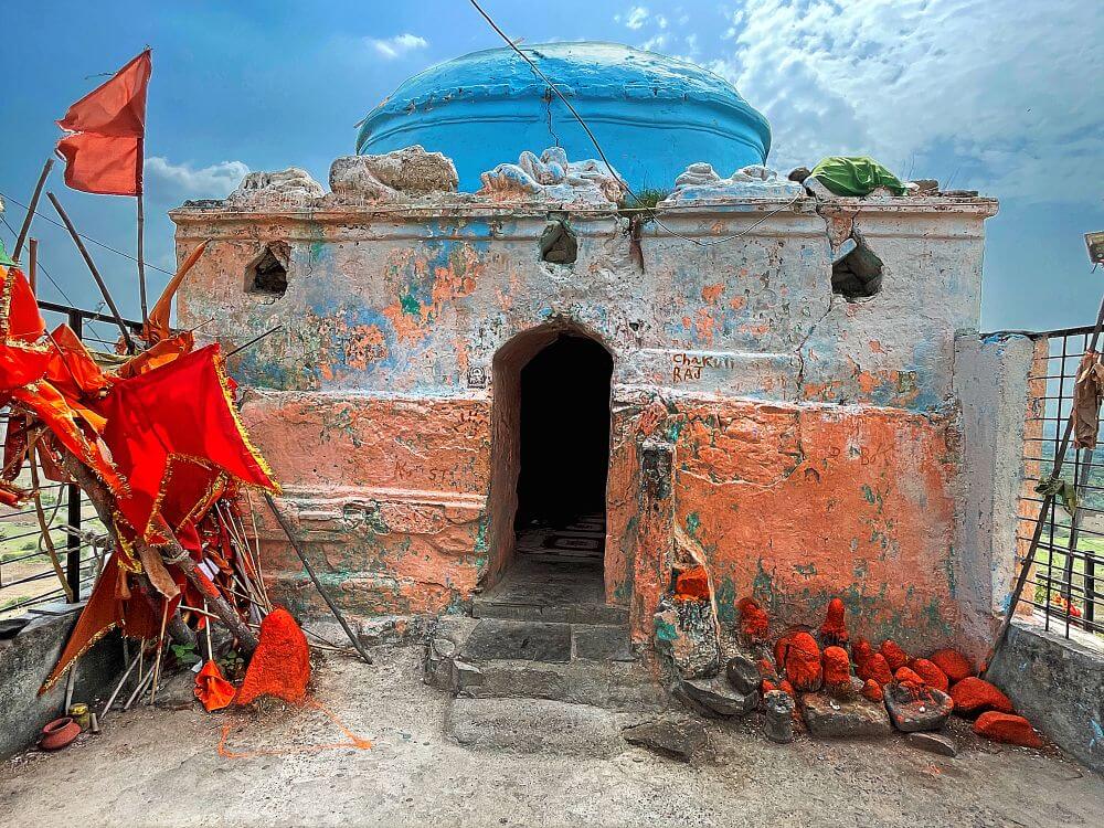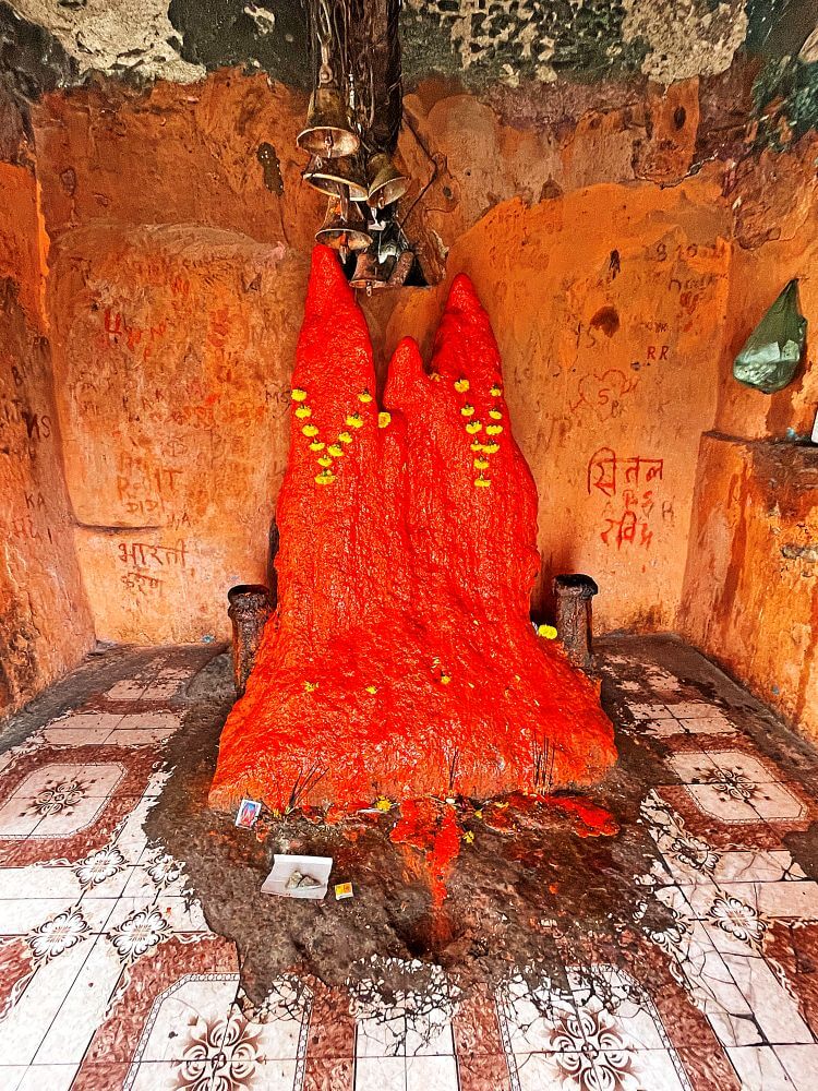मंदिराच्या मागील बाजूस काही अंतरावर डोंगर कड्यात अरुंद गुहा आहे. या गुहेच्या मुखाजवळील पाषाणांना शेंदूर लावलेला आहे. या ठिकाणी भाविकांनी तयार करून आणलेला शिऱ्याचा प्रसाद वाहिला जातो. या प्रसादाला कढई असे संबोधले जाते. वृक्षाच्या पानावर शिरा ठेवून, त्यावर फुल ठेवून ते पान देवापुढे ठेवण्याची प्रथा आहे.