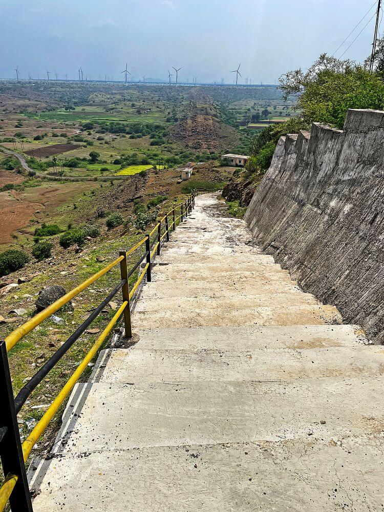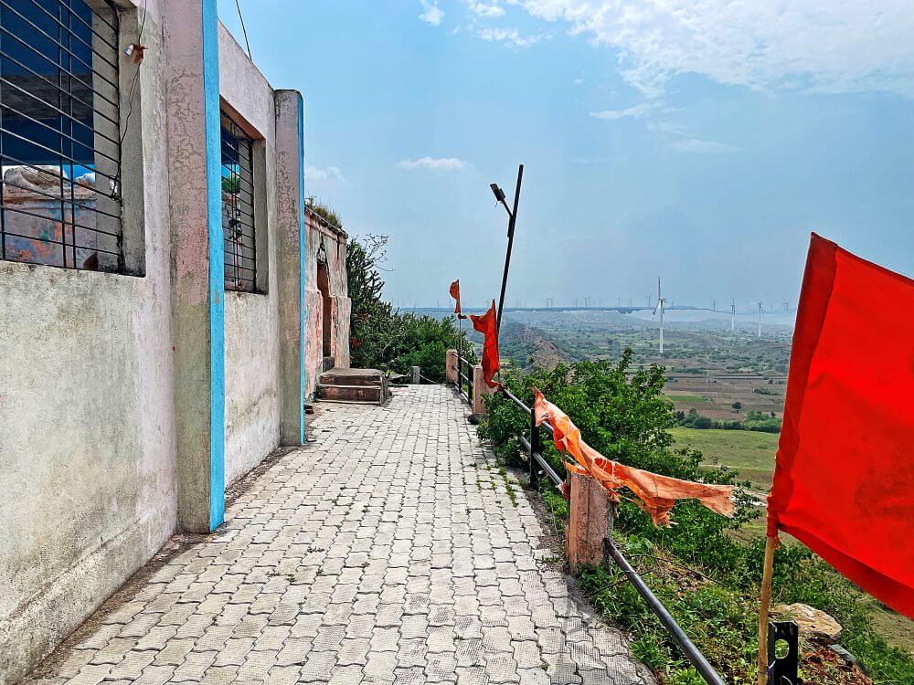 सोयीसुविधा पुरविल्या जातात. येथून कच्चा रस्ता व १०५ पायऱ्या चढून डोंगरमाचीवरील मंदिराच्या प्रांगणात प्रवेश होतो. या प्रांगणात दोन्ही बाजूस लोखंडी नळ्यांचे सुरक्षा कठडे लावलेले आहेत. येथून पुढे दोन बाजूला भिंती व त्यावर छत असलेला सभामंडप आहे. हा सभामंडप अलीकडील काळात बांधलेला आहे व त्याच्या भिंतींना खिडक्या आहेत.