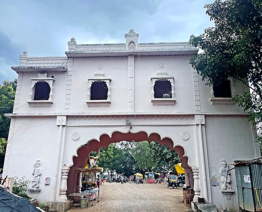 मंदिराकडे जाणाऱ्या रस्त्यावर भव्य स्वागतकमान आहे. रस्त्याच्या दोन्ही बाजूस प्रत्येकी चार नक्षीदार गोलाकार स्तंभ व त्यावरील सज्जावर पाच घुमटाकार शिखरे असे या स्वागतकमानीचे स्वरूप आहे. येथील सर्व स्तंभ एकमेकांना महिरपी कमानीने जोडलेले आहेत. येथून काही अंतरावर मंदिराचे दुमजली प्रवेशद्वार आहे. प्रवेशद्वारावर दोन्ही बाजूस द्वारपाल शिल्प आहेत. प्रवेशद्वारात चौकोनी स्तंभपाद असलेले नक्षीदार गोलाकार स्तंभ महिरपी कमानीने जोडलेले आहेत. प्रवेशद्वाराच्या आतल्या दोन्ही बाजूस पहारेकरी कक्ष व येथून वरील नगारखान्याकडे जाण्यासाठी जीना आहे. नगारखान्यात दोन्ही बाजूस प्रत्येकी चार खिडक्या आहेत. या खिडक्यांना बाह्य बाजूला सज्जा, स्तंभ व घुमट आहेत. नगारखान्याच्या छतावर चहुबाजूने कठडा आहे. कठड्यात मध्यभागी असलेल्या देवकोष्ठकात गणपतीची मूर्ती आहे. या कठड्यावर दहा लघूशिखरे आहेत.