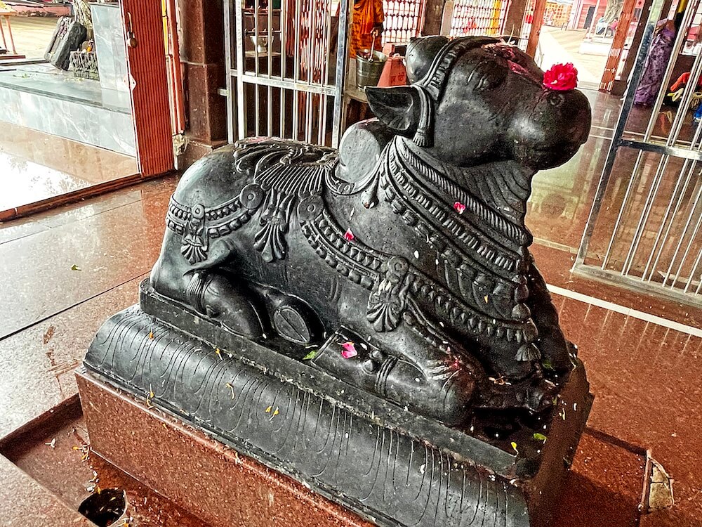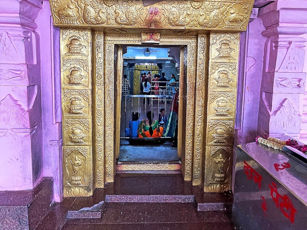 या प्रवेशद्वारातून मंदिराच्या पेव्हर ब्लॉक बसवलेल्या प्रांगणात प्रवेश होतो. या प्रांगणात प्रसाद व पूजा साहित्य विक्रीची अनेक दुकाने आहेत. प्रांगणापेक्षा उंचावर असलेल्या मंदिराच्या सभामंडपास समोरून एक व डाव्या तसेच उजव्या बाजूला प्रत्येकी एक अशी एकूण तीन प्रवेशद्वारे आहेत. समोरील प्रवेशद्वारासमोर महावृक्ष आहे व त्याभोवती पार बांधलेला आहे. उजव्या व डाव्या बाजूच्या प्रवेशद्वारास पाच पायऱ्या आहेत. पायऱ्यांच्या दोन्ही बाजूस स्टेनलेस स्टीलचे सुरक्षा कठडे आहेत. येथील सभामंडप अर्धखुल्या स्वरूपाचा आहे. यामध्ये २४ चौकोनी स्तंभ आहेत. स्तंभपाद व स्तंभदंड चौकोनी आहेत. स्तंभांचा वरचा भाग सुवर्णपटल आच्छादित आहे आणि त्यावर कमळ व मयूर नक्षी आहेत. वितानावर चक्राकार कमलदल नक्षी आहे. सभामंडपात मध्यभागी वज्रपीठावर नंदीची काळ्या पाषाणातील मूर्ती आहे. नंदीच्या मूर्तीपुढे अरुंद अंतराळ व त्यापुढे गर्भगृहाचे प्रवेशद्वार आहे. प्रवेशद्वाराच्या पहिल्या दोन द्वारशाखांवर पानाफुलांच्या नक्षी आहेत. तिसऱ्या द्वारशाखेवर खालील बाजूस गंगा-यमुना शिल्प व वरच्या बाजूला प्रत्येकी चार शिवपिंडींची शिल्पे आहेत. ललाटबिंबावर शिव-पार्वतीचे शिल्प व ललाटपट्टीवर चार मयूर आणि दोन नंदीशिल्पे आहेत. स्तंभशाखांवर सज्जा व प्रवेशद्वारावरील उत्तरांगावर शिखरनक्षीचे तोरण आहे. प्रवेशद्वारास धातुच्या पत्र्याने मढविलेले आहे. त्यावर ओम्, स्वस्तिक, मंगलकलश आदी नक्षी व शिल्पे आहेत.