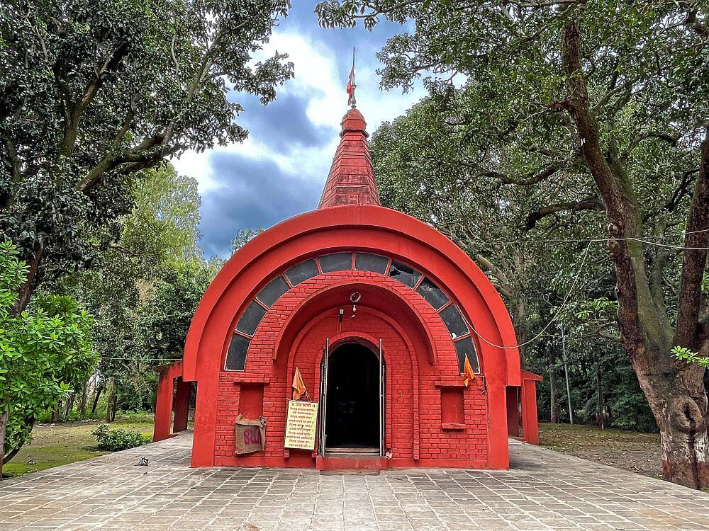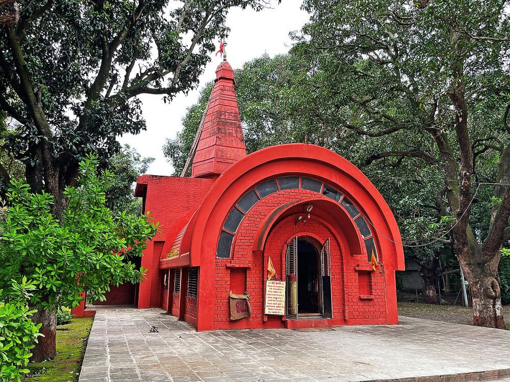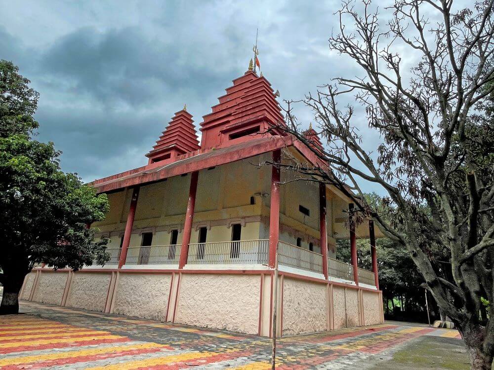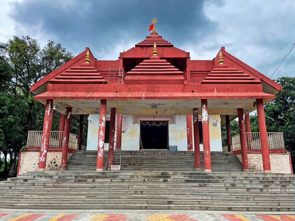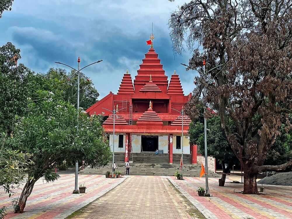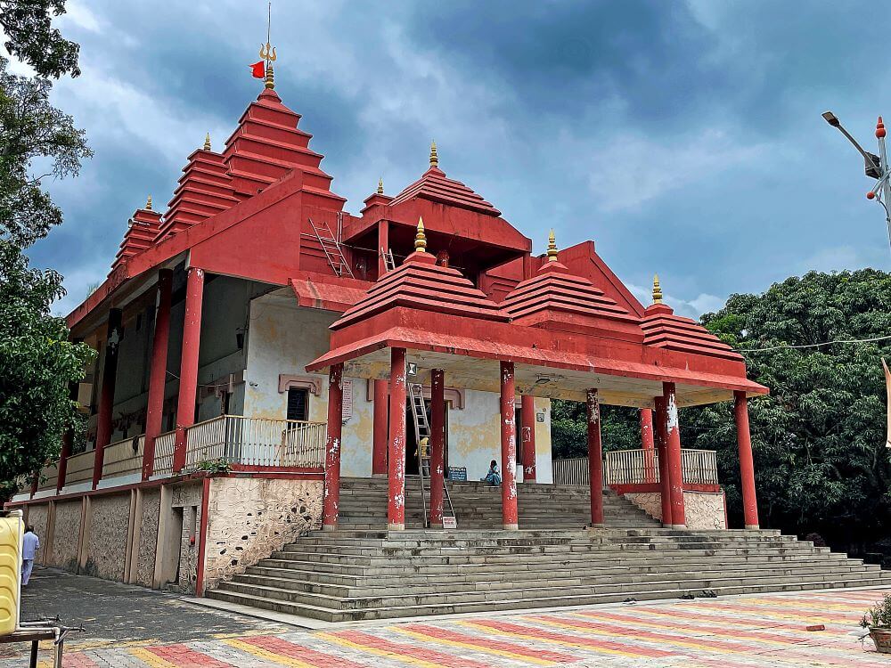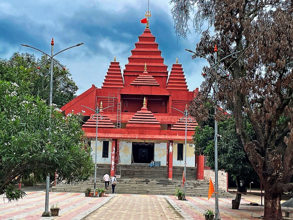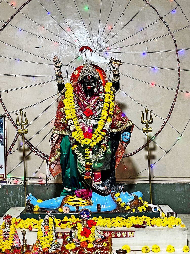 त्याचवेळी देवीचा पाय त्यांच्या शरीरावर पडला. साक्षात महादेव आपल्या पायाखाली असल्याचे दिसल्यावर तिची जीभ बाहेर आली. त्यामुळेच या मंदिरात तिच्या हातात रक्तबीज दैत्याचे शीर असून तिच्या पायाखाली निद्रिस्त महादेव आहेत.