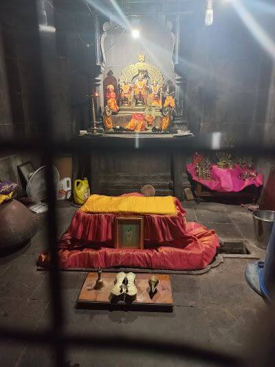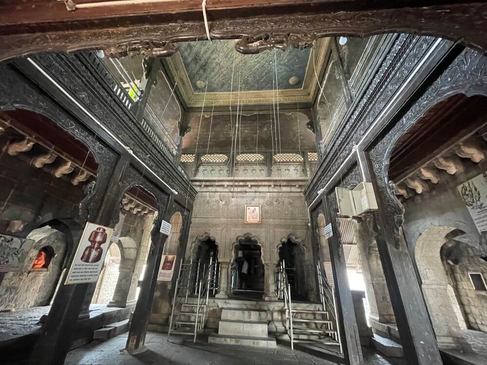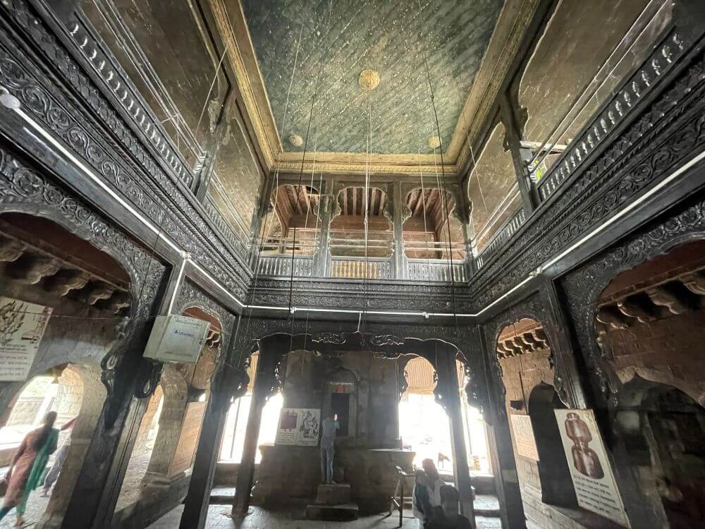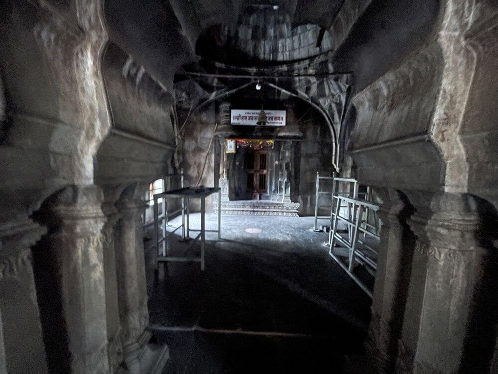गर्भगृहात मागील भिंतीलगत वज्रपिठावरील मखरात श्रीराम, लक्ष्मण, सीता व मारूती यांच्या मूर्ती आहेत. मंदिराच्या छतावर भूमीज शैलीतील चार थरांचे चौकोनी शिखर आहे. शिखराच्या प्रत्येक थरात उभ्या रचनेची मंदिर शिल्पे आहेत. शिखरात शीर्षभागी स्तूपी, त्यावर चांदीचा कळस व ध्वजपताका आहे.