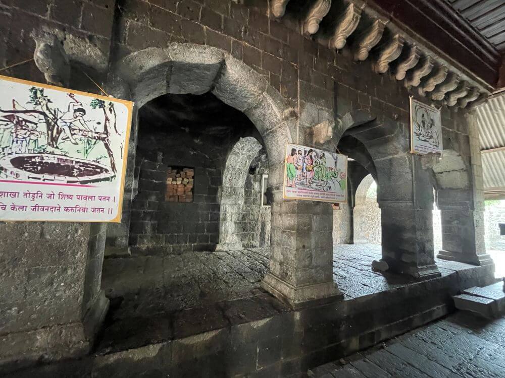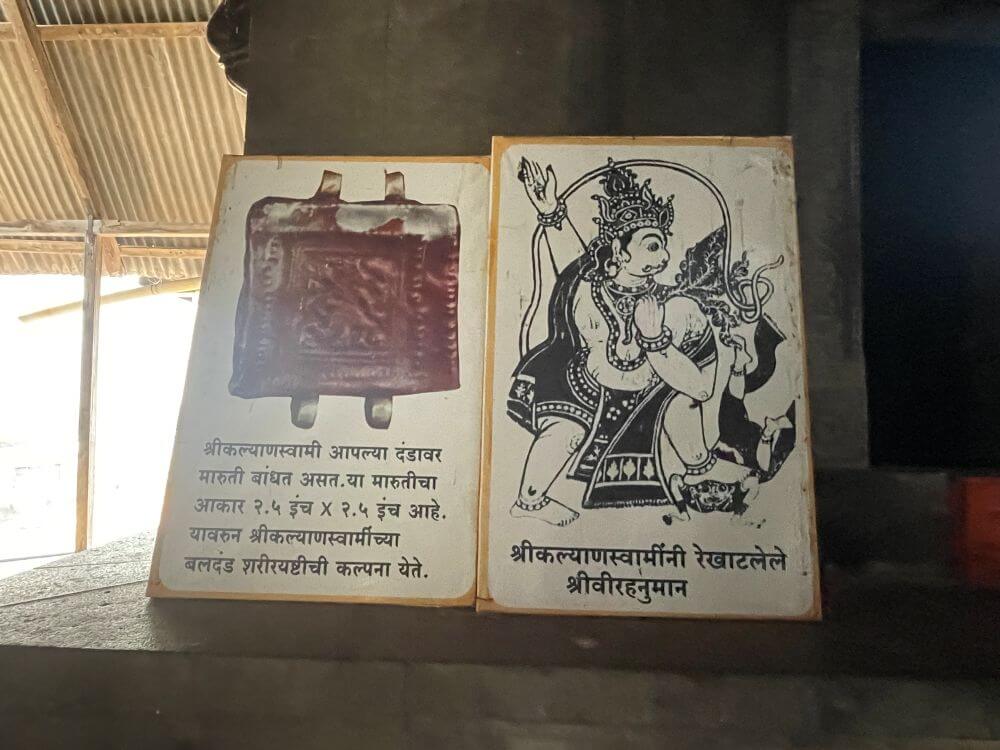 पुढे दगडी बांधणीचे अंतराळ व गर्भगृह आहे. अंतराळाच्या प्रवेशद्वारास तीन महिरपी कमानींनी जोडलेले चार नक्षीदार स्तंभ आहेत. येथील भिंतींवर चक्रनक्षी व पशू शिल्पे आहेत. मध्यभागी कल्याणस्वामींचे चित्र आहे. भिंतींच्या सज्जाला खालील बाजूस पाषाणी झुंबर आहेत. बंदिस्त स्वरूपाच्या अंतराळात डाव्या व उजव्या बाजूला प्रदक्षिणा मार्गावर दरवाजे आहेत. अंतराळातील देवकोष्टकात कल्याणस्वामींच्या हस्ताक्षरातील दासबोध ग्रंथाची प्रत आहे. अंतराळातील पाषाणी स्तंभांवर विविध नक्षी आहेत. पुढे गर्भगृहाच्या प्रवेशद्वाराच्या द्वारशाखांवर स्तंभनक्षी व पानाफुलांची नक्षी आणि ललाटबिंबावर मारूतीची मूर्ती आहे. गर्भगृहात जमिनीवर मध्यभागी कल्याणस्वामी यांची वालुकामय पाषाणाची समाधी आहे. समाधीवर पादुका व शिवपिंडी आहेत आणि त्यावर भगवद्गीतेचे श्लोक कोरलेले आहेत.