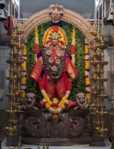 सज्जा असलेल्या लाकडी बांधकामाने त्याचे छत तोललेले आहे. पुढील मंडपात प्रवेश करण्यासाठी असलेला प्रवेशद्वाराच्या दोन्ही बाजूंना वेताळ, काळभैरव, सटी आणि खुटी आदी देवतांची स्थाने आहेत. प्रवेशद्वार लाकडी नक्षीने सुशोभित करण्यात आले आहे. त्यापुढे असलेल्या अर्धसभामंडपातून पुढील महामंडपात जाणाऱ्या प्रवेशद्वारावर दगडी नक्षीकाम आहे. त्यानंतर लागणाऱ्या मुख्य सभामंडपाचा तोल नक्षीदार खांबांनी सावरला आहे. हंड्या झुंबरे असलेल्या छतावरही लाकडी नक्षीकाम आहे. पुढे अंतराळ असून त्याची दर्शनी भिंत चांदीच्या पत्र्याने मढवण्यात आली आहे. त्यावर नाजुक कोरीव काम आहे. त्याच भिंतीवर डाव्या उजव्या बाजुला असलेल्या देवकोष्टकात एका बाजुला त्रिमुखी दत्त तर दुसऱ्या बाजुला गणपती विराजमान आहेत. नक्षीकामांनी सजलेल्या द्वारचौकटीवर कीर्तीमुख व त्यावरील भागात गणपती आहे. गर्भगृहाचे प्रवेशद्वारही चांदीच्या पत्र्याने सजवलेले आहे. गर्भगृहात महिषासुरमर्दिनीच्या स्वरुपातील देवीची मूर्ती आहे. देवी चतुर्भुज असून देवीच्या वरच्या दोन हातात तलवार आणि ढाल आहे. खालच्या दोन्ही हातांनी ती महिषासुराचा वध करत आहे.