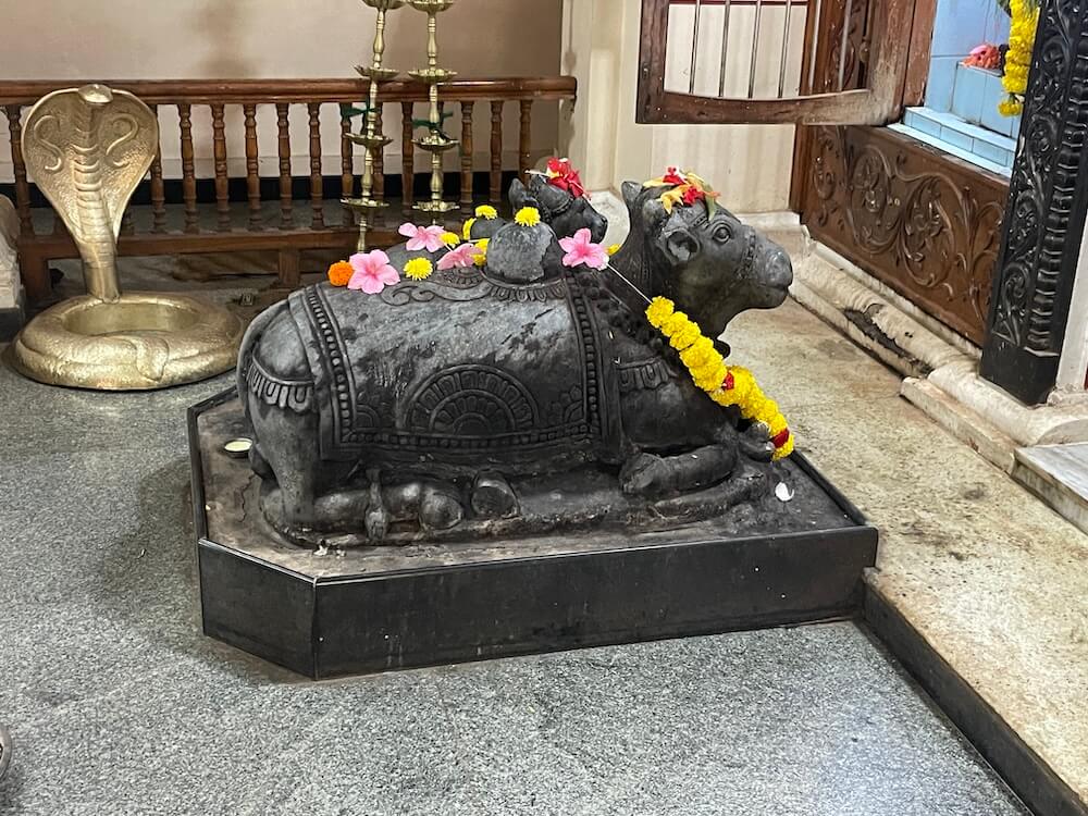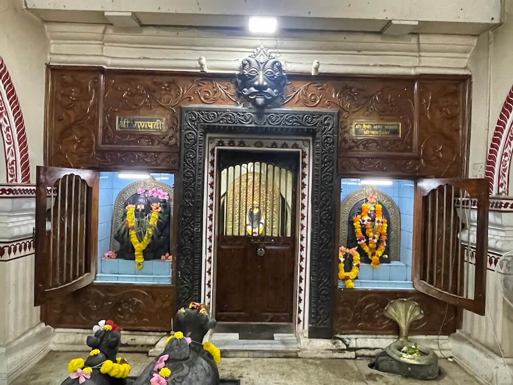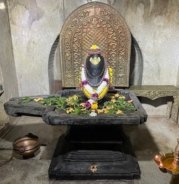 शिवपिंडीच्या दोन्ही बाजूला पितळी लामण दिव्यांच्या माळा टांगलेल्या आहेत.