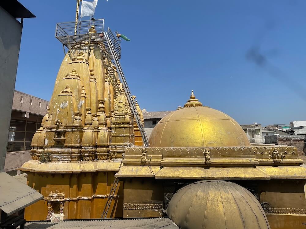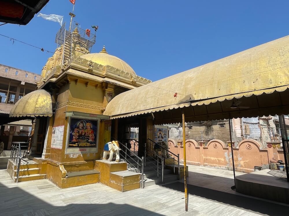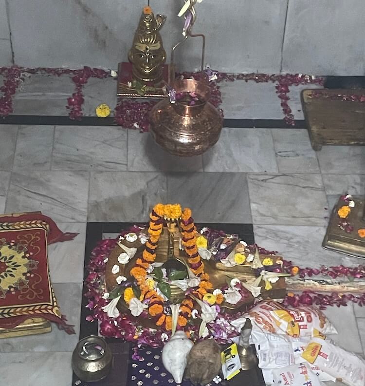Descending four steps from the vestibule, one enters the sunken Garbhagriha. At its heart lies the Pindi (sacred stone) of Kamnath Mahadev, adorned with a central mask of the Lord. To the right of the Shivling, a large brass lamp holds the Akhand Jyot that has remained lit for centuries. Above the Sabhamandap sits a domed Shikhara (spire), while a tapering stone spire, rising to a height of 50 feet, crowns the Garbhagriha. The exterior of this spire is embellished with numerous smaller Urushringa (subsidiary) spires, culminating at the very peak with a magnificent golden Kalasha (finial).