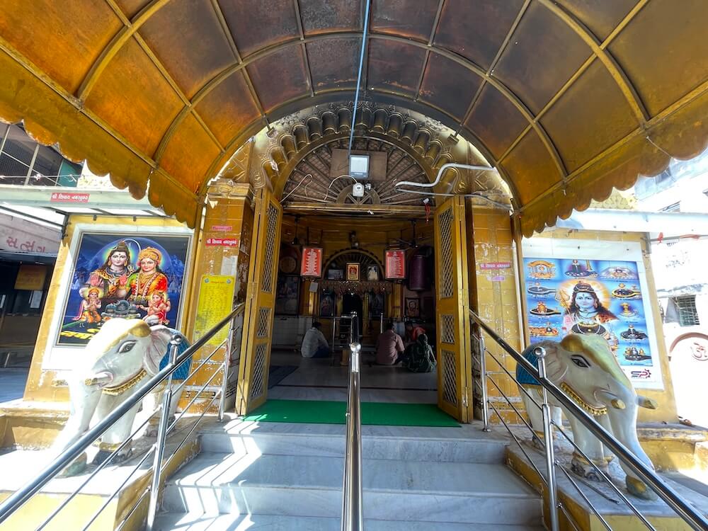 The construction of the Kamnath Temple is heavily influenced by Hindu temple architecture, specifically the ‘Maru-Gurjara’ style. The entrance is flanked by intricately carved Gajraj (regal elephants). The structure comprises a Sabhamandap (assembly hall), an Antaral (vestibule) and a Garbhagriha (sanctum sanctorum). Ascending five steps from the courtyard, one enters the Sabhamandap, which is built upon a raised Jagati (plinth). This enclosed hall features two doors on the left and right flanks. At its centre, upon a raised pedestal, sits the Nandi (sacred bull). Beyond this, in the Antaral, the niches flanking the sanctum entrance house an ancient stone idol of a Goddess on one side and Lord Ganesha on the other. The doorframes of the sanctum are adorned with sculptures of Dwarpalas (gatekeepers) at the base, alongside images of Shiva and Parvati.