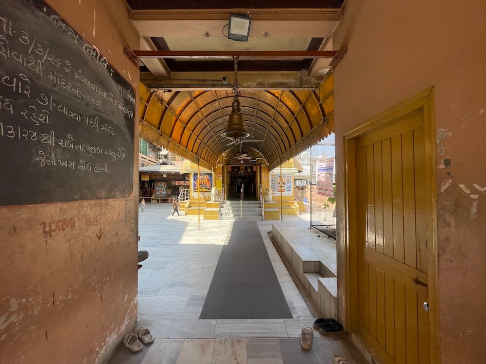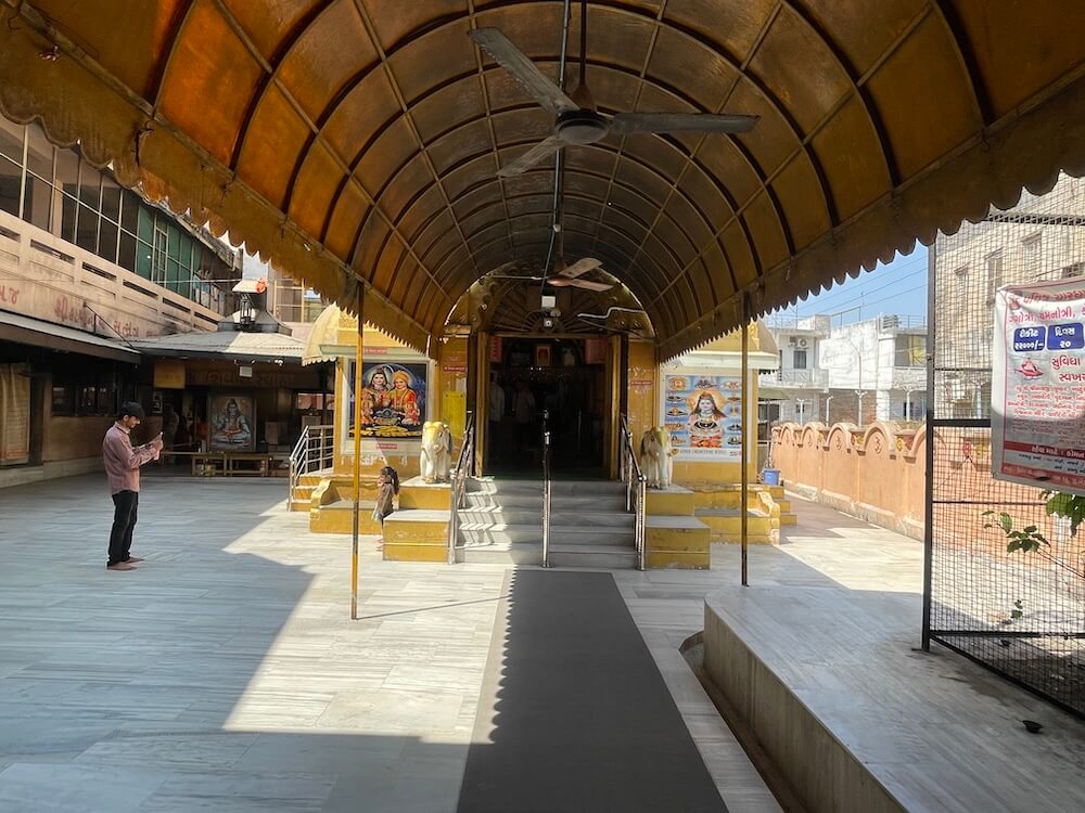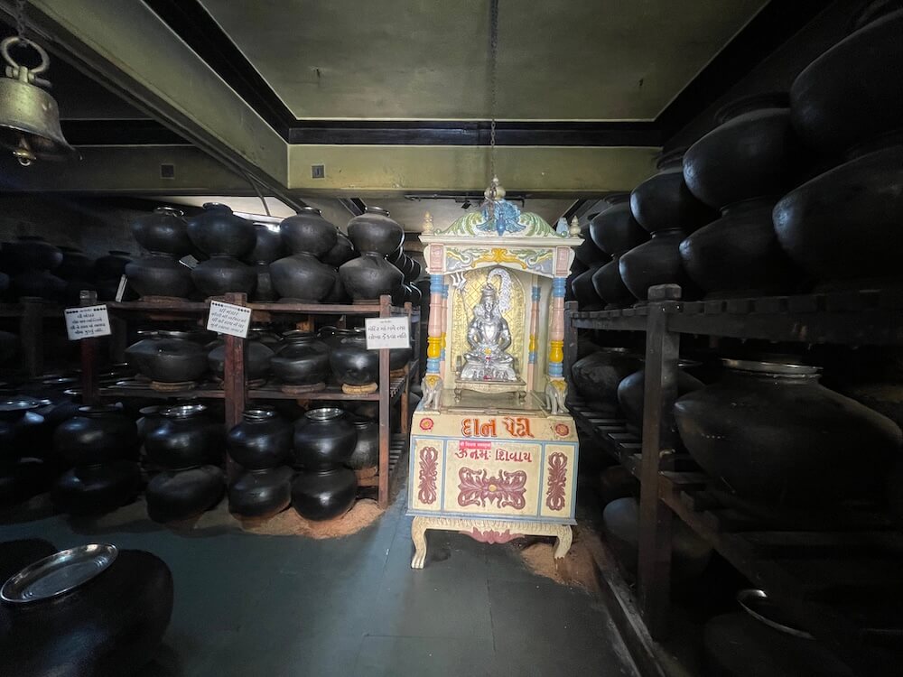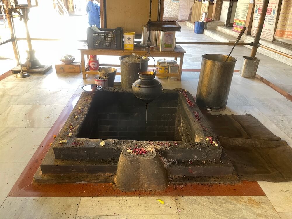 Situated between these storehouses and the temple is a grand Yagnashala (hall for fire rituals). Within its Hom-kunda (sacrificial fire pit), a continuous stream of pure ghee is offered, filling the temple air with a distinct fragrance. On the floor above the ghee storehouse, a ‘Nishulk Annachhatra’ (free kitchen) operates in the name of Ravishankar Maharaj, providing Mahaprasad (blessed food) to the visiting faithful.