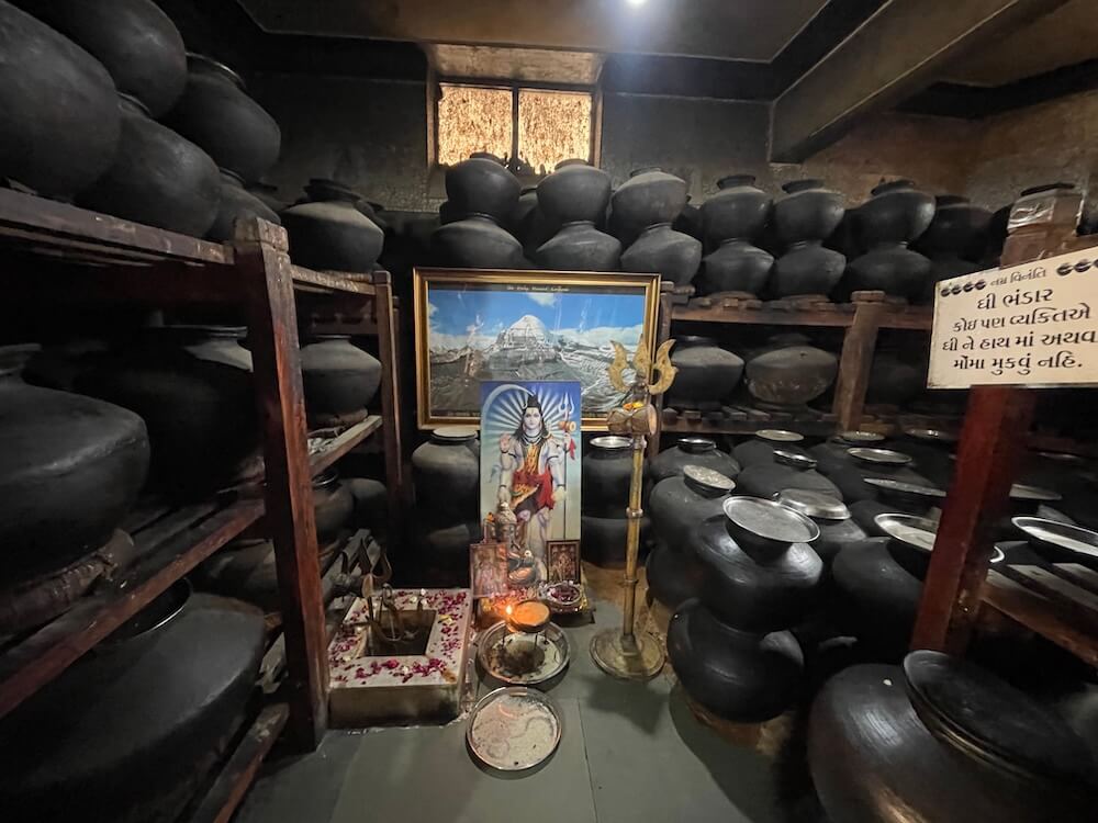 The temple complex, nestled on the riverbank, is expansive. Upon entering through the main gateway, one arrives at a courtyard that houses the temple office and rest facilities for pilgrims. Adjacent to the main structure within the courtyard are four large storehouses, where approximately 800 to 1,200 earthen pots are arranged in disciplined rows. Each pot holds about 50 kilograms of ghee.