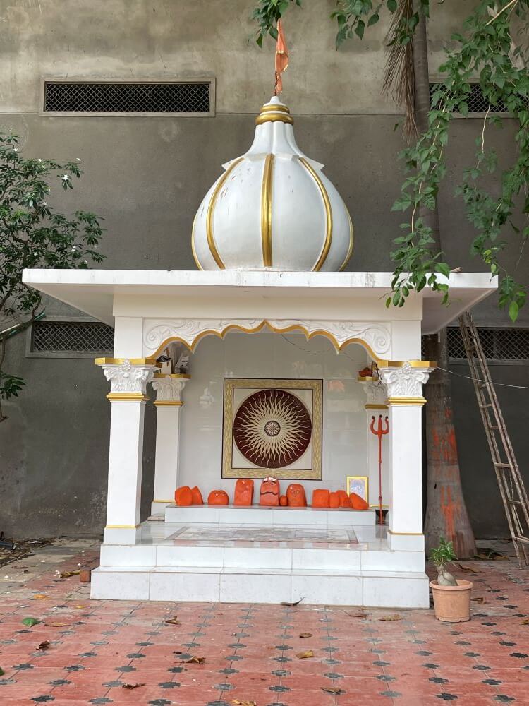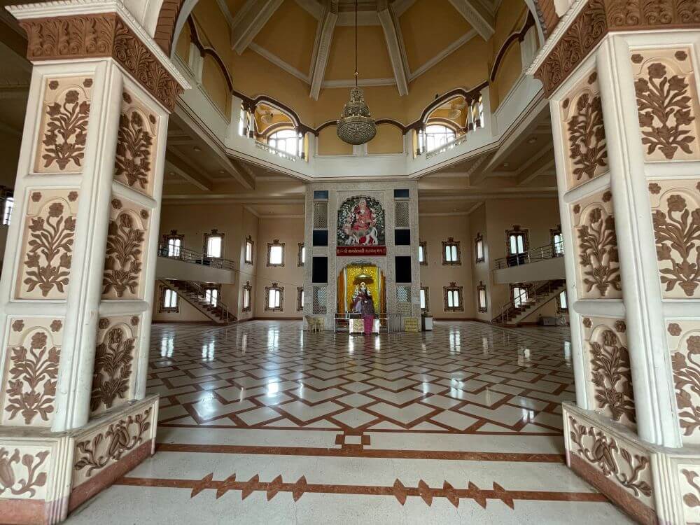 A golden crown rests upon her head and she is adorned with rich vestments and ornaments. Above her spreads a great brass parasol. The circumambulatory path around the sanctum begins from the assembly hall itself.