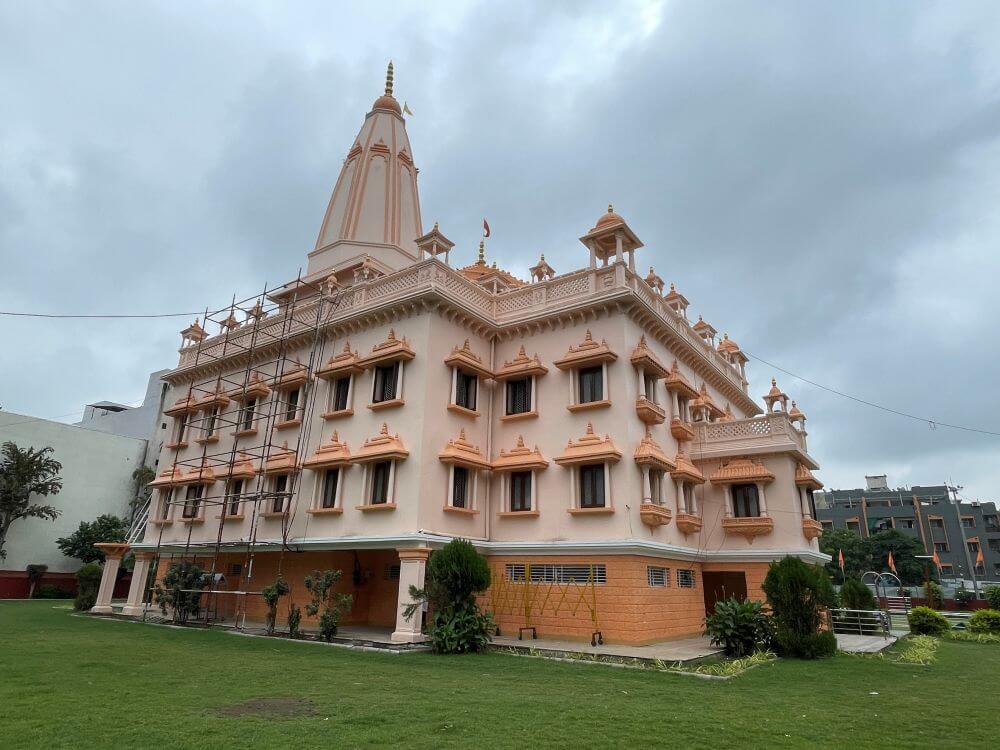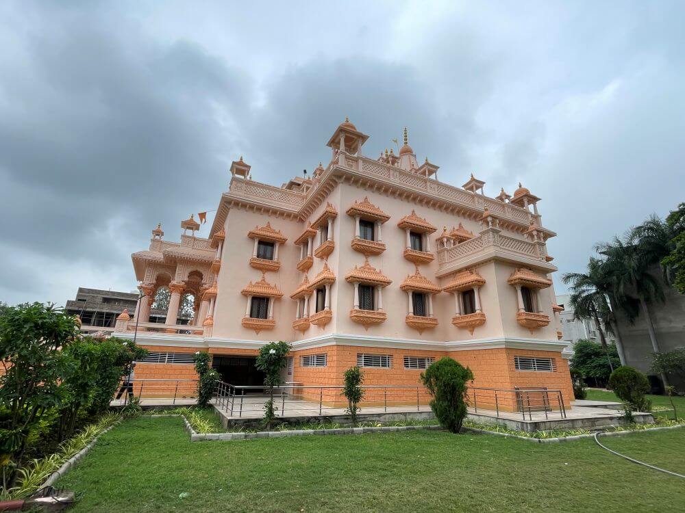Occupying roughly sixty thousand square feet, the temple, which looks like a splendid palace, is set within a landscaped precinct. A magnificent southern-style gateway forms the ceremonial entrance; its pillars and arches are adorned with fine carving. The gateway carries one main shikhara and six subsidiary spires and within it are benches for devotees to sit. Directly ahead lies a large water tank with a fountain. Throughout the forecourt, lamp posts and flowering shrubs add grace and the entire area is neatly paved in stone.