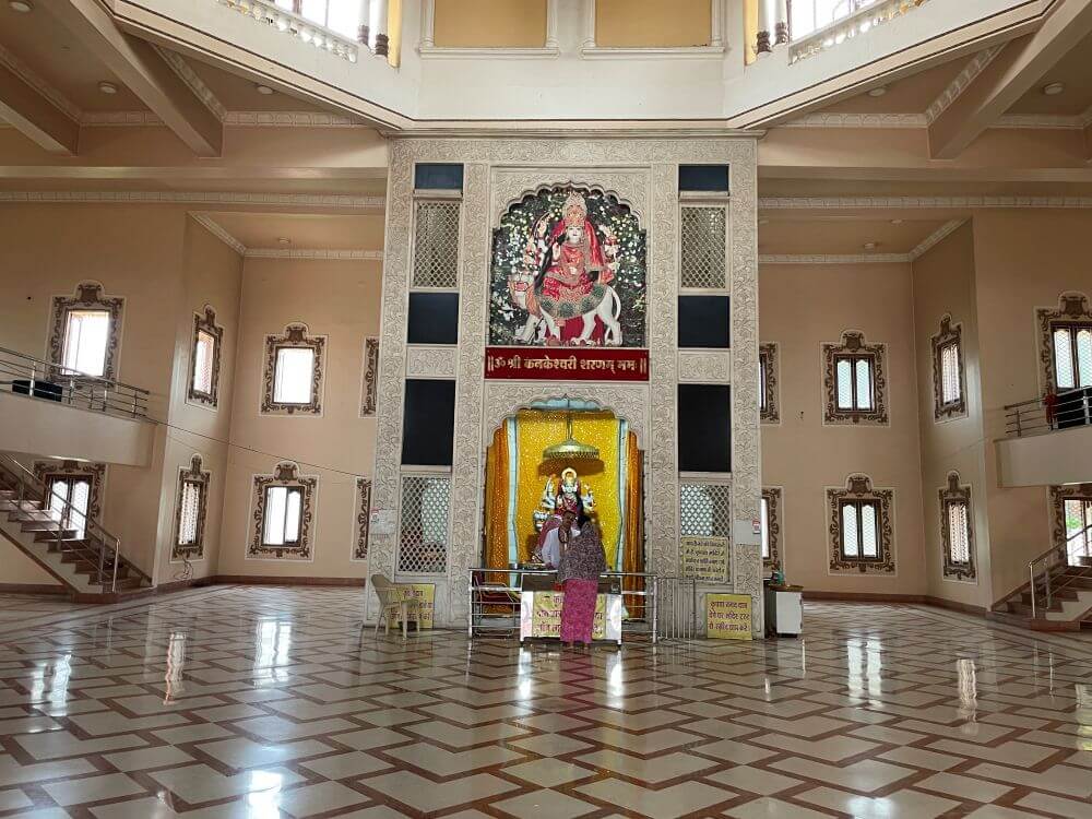 Entry into the sabha-mandapa is through a round, arched portal. This two-storied hall is spacious and airy. The upper floor runs as a balcony on all four sides, leaving the middle open to the height, from which a grand chandelier is suspended. Directly ahead stands the tall sanctum of the temple. Fashioned from carved Makrana marble, its doorway is a graceful cusped arch and above it is a large image of Jaganmata (the world-mother) Kanakeshwari riding a lion. Within, upon a high pedestal, is enshrined the idol of Kanakeshwari Mata. Carved from a single block of marble and brought from Jaipur, the goddess is shown lion-borne, six-armed and bearing weapons.