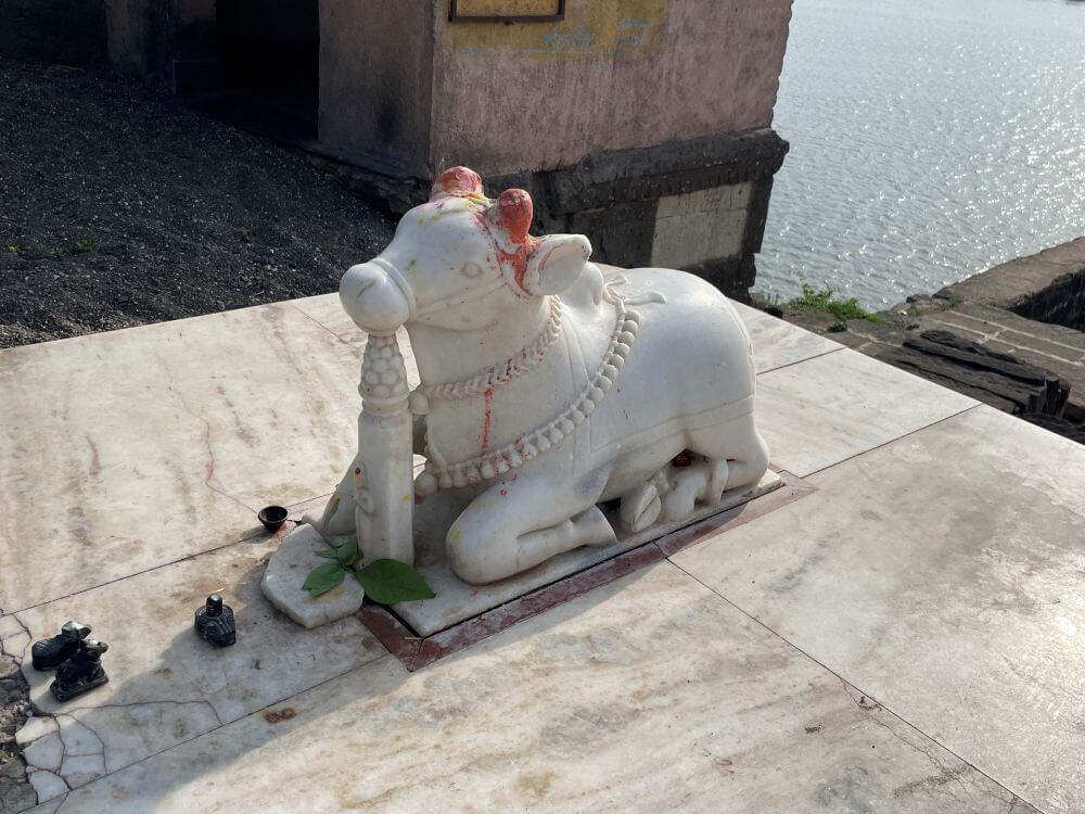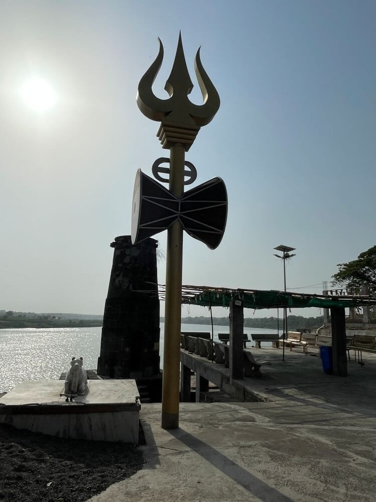 मंदिरासमोर संगमरवरी पाषाणातील नंदीची मूर्ती आहे. त्याशेजारी २४ फूट उंचीचा त्रिशूल व डमरू आहे. हेमाडपंती स्थापत्यशैलीतील पूर्वाभिमुख