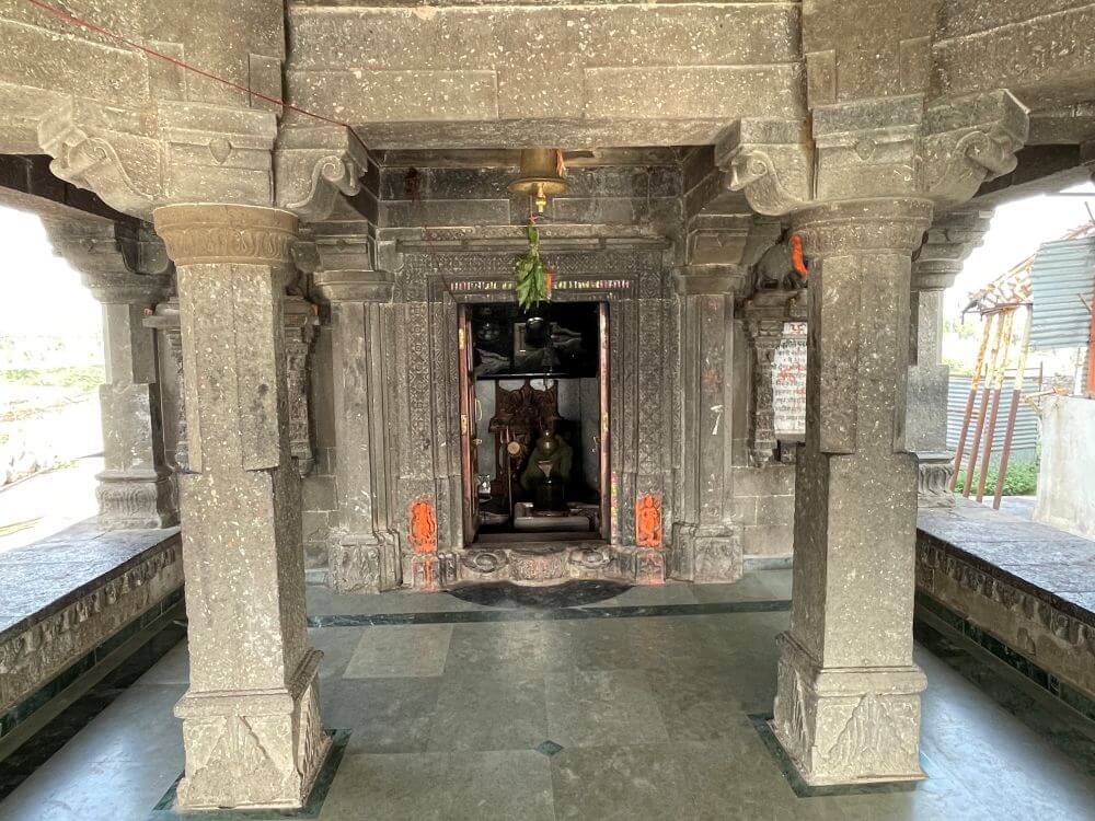 मंदिराच्या सभामंडपात प्रवेश करण्यासाठी पूर्व, दक्षिण व उत्तर दिशेला असलेल्या प्रवेशद्वारांस मुखमंडप आहेत. मुखमंडपास दोन्ही बाजूस कठडा व त्यावर स्तंभ आहेत. कठड्याला वरच्या बाजूस पुष्पलता नक्षी आहे. नक्षीदार स्तंभांचा पाया व खालील निम्मा भाग चोकोनी व वरील भाग अष्टकोनी आहे. त्यावर कमळ फुलांची नक्षी असलेल्या वर्तुळाकार कणी व कणीवर कमळ व पर्ण नक्षी कोरलेले हस्त आहेत. हस्तांवर तुळई व त्यावर छत आहे. पूर्वेकडील मुखमंडपाच्या स्तंभांवरील तुळईवर उपरोक्त शिलालेख आहे.