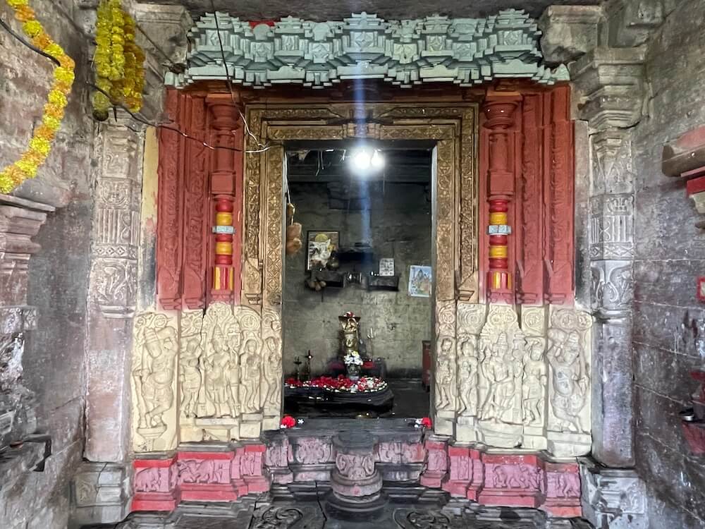 पुढे सभामंडपापेक्षा अरुंद अंतराळ आहे. या अंतराळात डाव्या व उजव्या बाजूला प्रत्येकी एक देवकोष्ठक आहे. उजव्या बाजूच्या देवकोष्ठकात गणेशाची मूर्ती आहे. गर्भगृहाच्या प्रवेशद्वाराला पाच द्वारशाखा आहेत. द्वारशाखांच्या खालील बाजूस द्वारपाल व द्वारपालिका शिल्पे आहेत. तसेच वर वेलबुट्टीशाखा, पर्णशाखा, पुष्पशाखा, स्तंभशाखा आहेत. ललाटबिंबावर गणपती शिल्प आहे, तर ललाटपट्टीत पानाफुलांची नक्षी आहे. उंबरठ्यास चंद्रशिला आहे, जिच्यावर कीर्तीमुख शिल्पे कोरलेली आहेत. प्रवेशद्वाराच्या दोन्ही बाजूस नक्षीदार स्तंभ आहेत, ज्यांवर प्रवेशद्वाराचे तोरण आहे. तोरणात शिखरशिल्पे आहेत. गर्भगृहात जमिनीवर मध्यभागी शिवपिंडी आहे. गर्भगृहात मागील भिंतीलगतच्या वज्रपीठावर पार्वतीची मूर्ती आहे. बाजूला शक्ती देवतेची मूर्ती आहे. सभामंडप, अंतराळ व गर्भगृहात छताला पितळी घंटा टांगलेल्या आहेत.