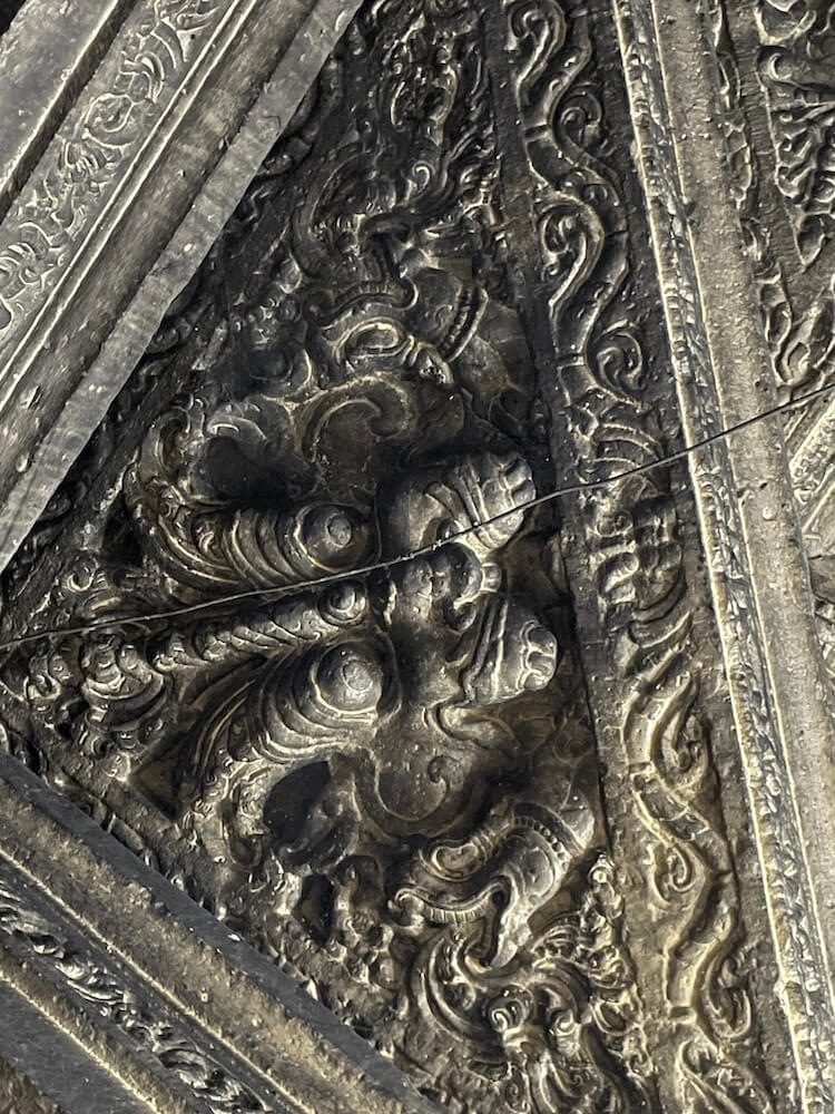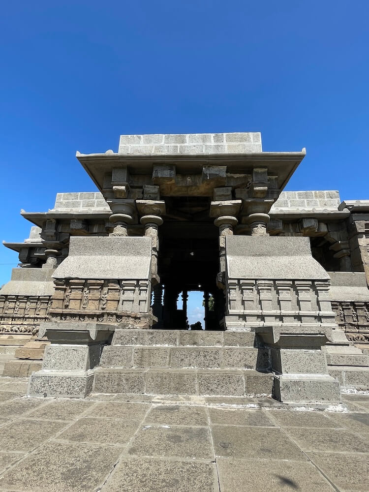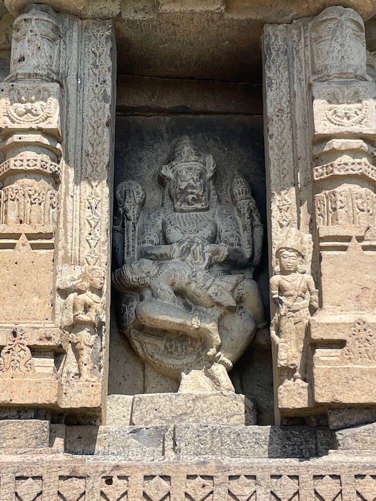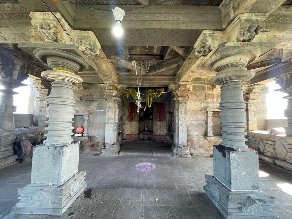 गावापासून काही अंतरावर असलेल्या या मंदिरापर्यंत जाण्यासाठी पक्की सडक आहे. हे मंदिर सुमारे चार फूट उंच जगतीवर बांधलेले आहे. जगतीवर चढण्यासाठी कोरीव पाषाणात बांधलेल्या सुमारे पाच पायऱ्या आहेत. तीन दिशांना तीन मुखमंडप, सभामंडप, अंतराळ व गर्भगृह अशी मंदिराची रचना आहे. या तिन्ही मुखमंडपांसमोर प्रत्येकी पाच पायऱ्या आहेत. पायऱ्यांच्या दोन्ही बाजूस सुरक्षा कठडे व चौथरे आहेत. मुखमंडपात प्रवेशद्वाराच्या दोन्ही बाजूला कठडे आहेत, ज्यात भाविकांना बसण्यासाठी कक्षासने आहेत. कक्षासनांत आठ अर्धस्तंभ चौकोनी स्तंभपादावर उभे आहेत. स्तंभदंडात चौकोन, षट्कोन, अष्टकोन आणि वर्तुळ असे भौमितिक आकार आहेत. स्तंभांच्या शीर्षभागी कणी आणि त्यावर हस्त आहेत. हस्तांवर छताचा भार तोलून धरणारी भारवाहक यक्षांची शिल्पे कोरलेली आहेत. येथील वितानावर चक्राकार नक्षी आहे. मुखमंडपाचा भाग पुरातत्त्व विभागाने पुनर्निर्मित केला असल्याने तो मंदिराच्या इतर भागापेक्षा नवा वाटतो. मुखमंडपातील जमीन सभामंडपातील जमिनीपेक्षा काही इंच उंच आहे.