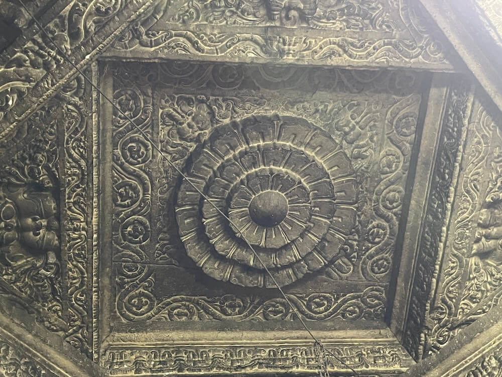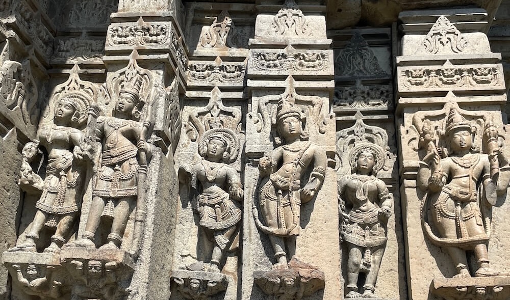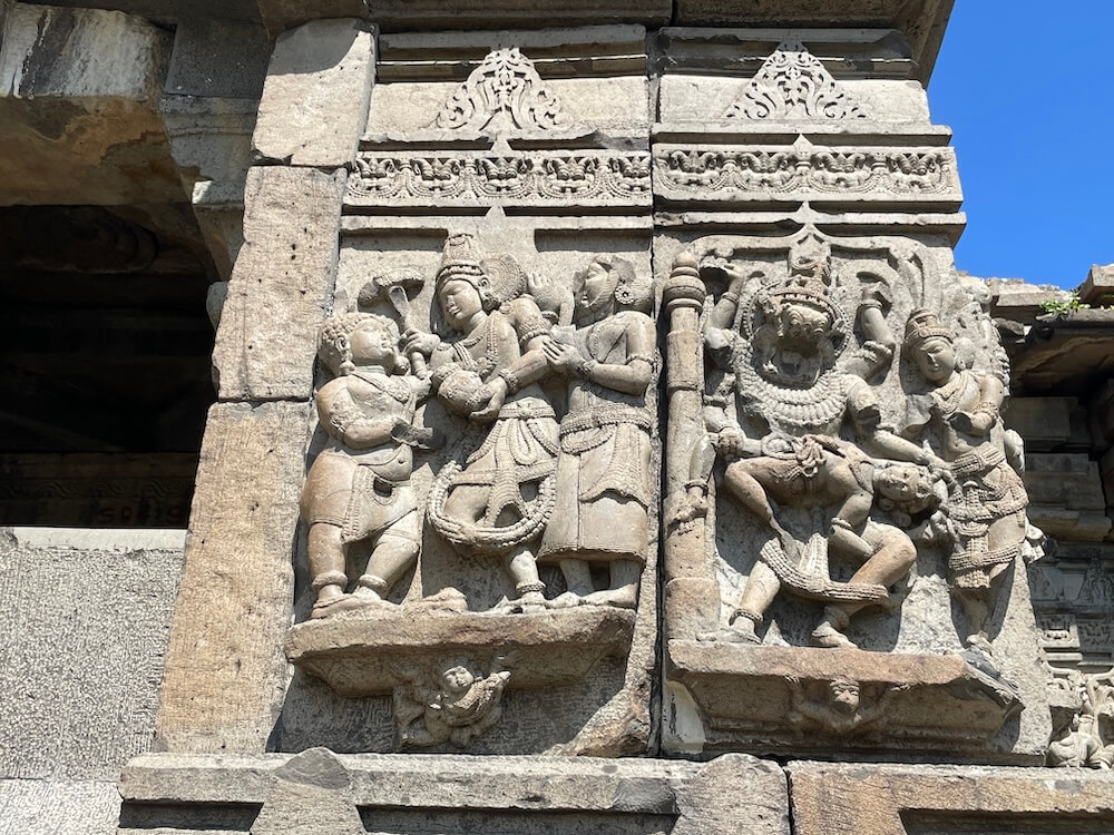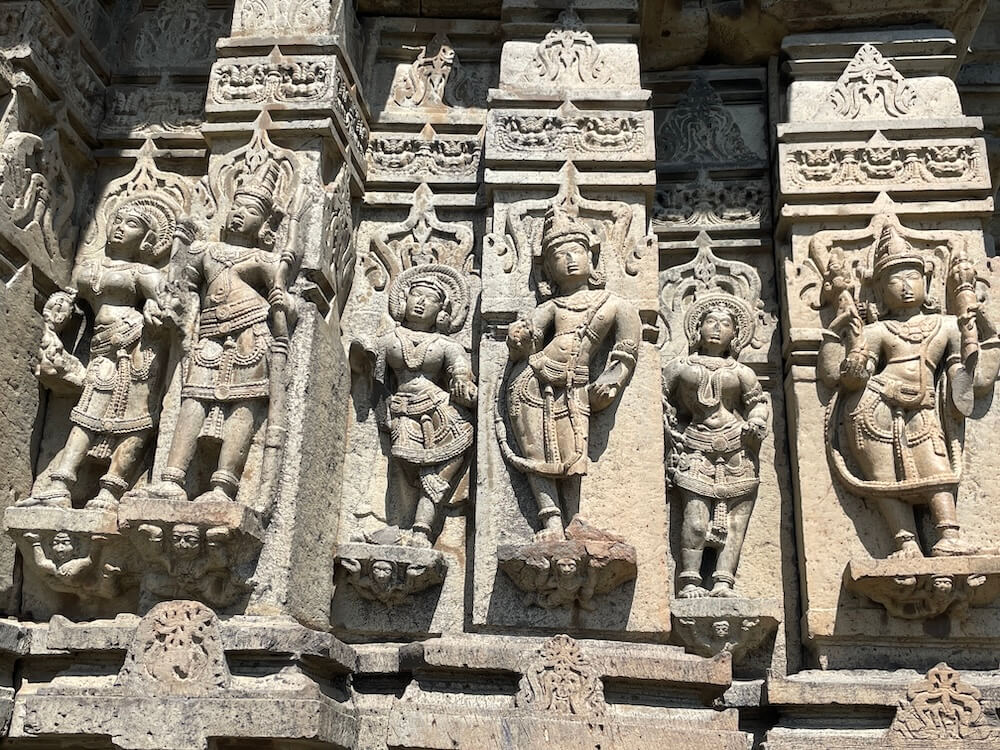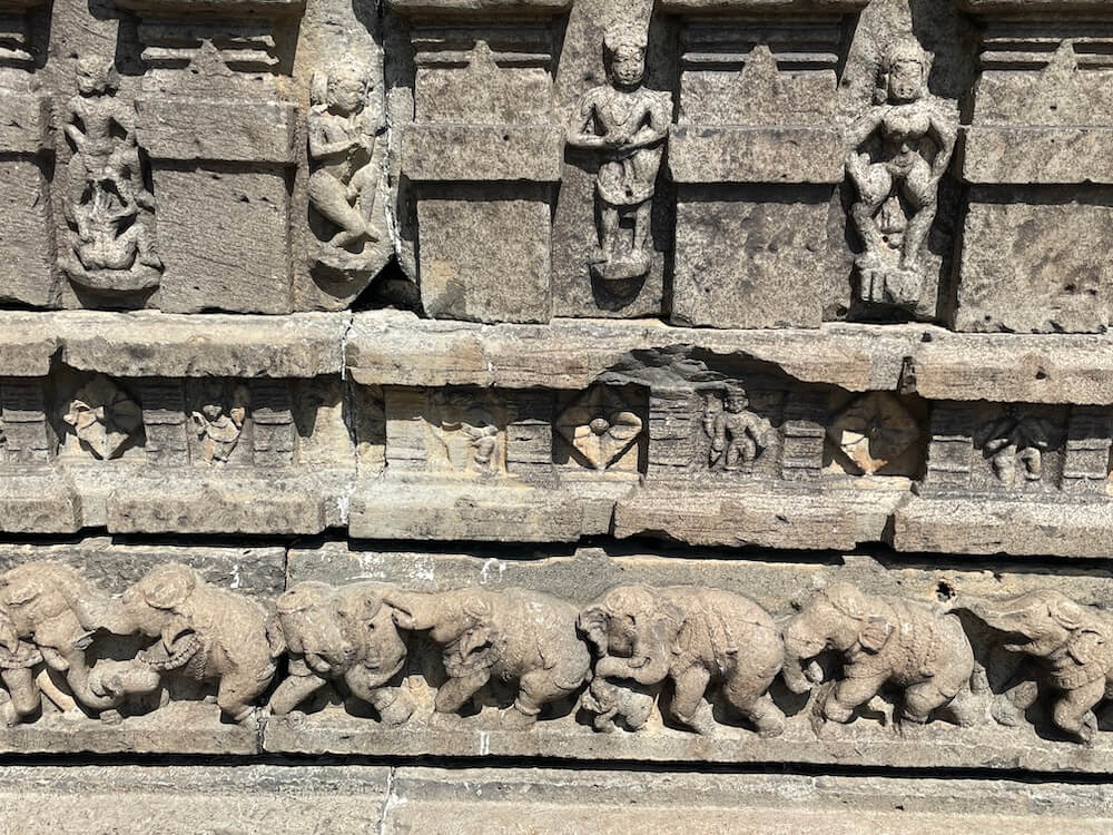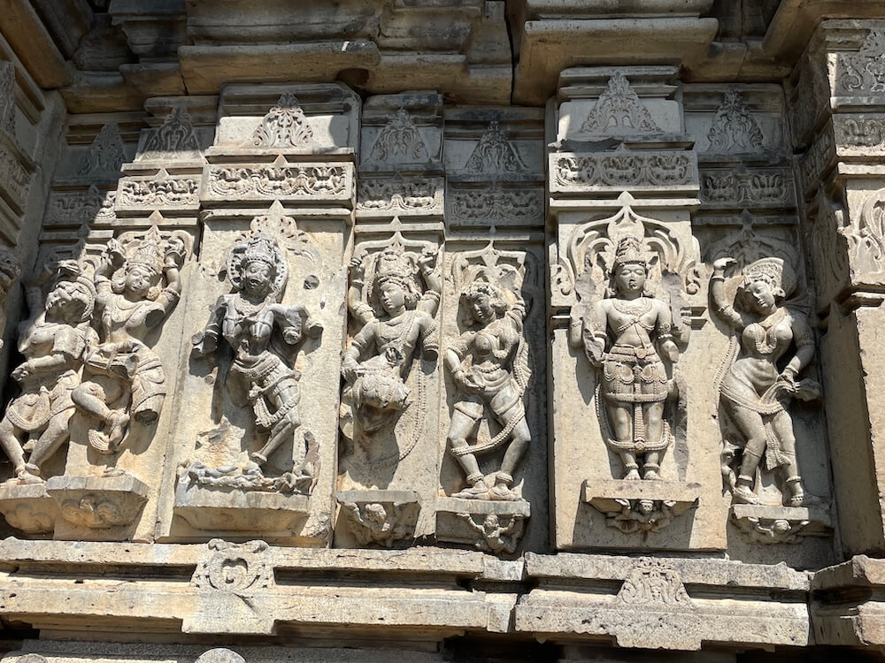 मंदिराचा बाह्य भाग सुबक नक्षी व शिल्पांनी सुशोभित आहे. मंदिराच्या अधिष्ठानावर गजथर व इतर नक्षी आहे. मंडोवरावर विविध प्रकारची शैव व वैष्णव शिल्पे आहेत. यात विष्णूचे दशावतार, गौरीहर, ब्रह्मदेव, उग्रकाली, चतुर्भुज गरुड, बटू वामन व राजा बली यांची शिल्पे आहेत. तसेच शुकसारिका, पुत्रवल्लभा, मर्दला, विषकन्या, शुभगामिनी, पत्रलेखिका आदी सूरसुंदरी शिल्पे आणि काही कामशिल्पे आहेत. सर्व शिल्पांच्या पीठाखाली शिल्पपीठाचा भार तोलून धरणारी यक्षशिल्पे आहेत. मंडोवरावर प्रसव शिल्प आहे, जे अनोखे आहे. मंडोवराच्या मागील बाजूला मकर प्रणाल आहे व त्यावर आरूढ गंगा शिल्प आहे.