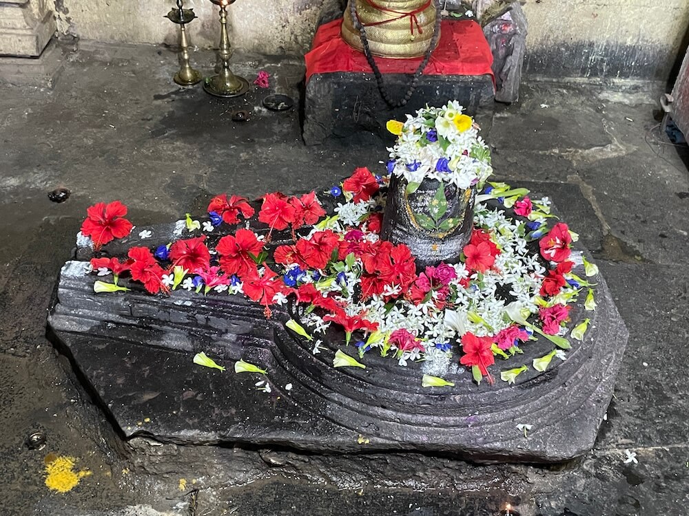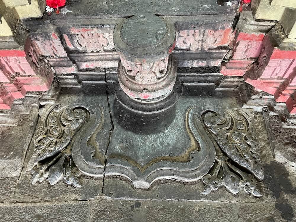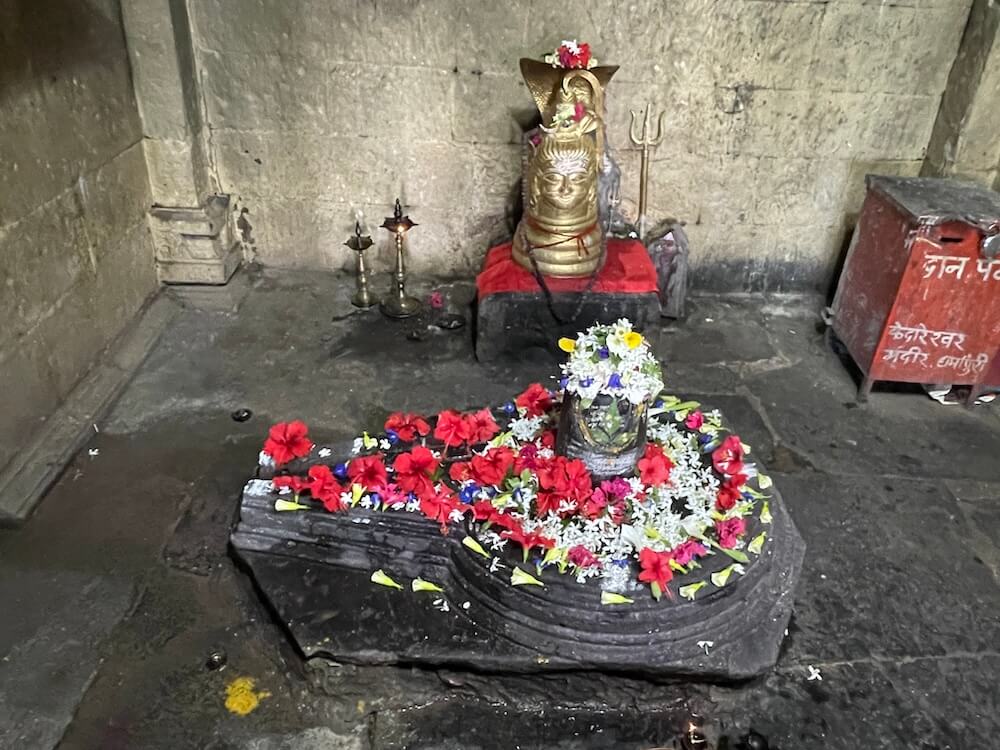 पुढे सभामंडपापेक्षा अरुंद अंतराळ आहे. या अंतराळात डाव्या व उजव्या बाजूला प्रत्येकी एक देवकोष्ठक आहे. उजव्या बाजूच्या देवकोष्ठकात गणेशाची मूर्ती आहे. गर्भगृहाच्या प्रवेशद्वाराला पाच द्वारशाखा आहेत. द्वारशाखांच्या खालील बाजूस द्वारपाल व द्वारपालिका शिल्पे आहेत. तसेच वर वेलबुट्टीशाखा, पर्णशाखा, पुष्पशाखा, स्तंभशाखा आहेत. ललाटबिंबावर गणपती शिल्प आहे, तर ललाटपट्टीत पानाफुलांची नक्षी आहे. उंबरठ्यास चंद्रशिला आहे, जिच्यावर कीर्तीमुख शिल्पे कोरलेली आहेत. प्रवेशद्वाराच्या दोन्ही बाजूस नक्षीदार स्तंभ आहेत, ज्यांवर प्रवेशद्वाराचे तोरण आहे. तोरणात शिखरशिल्पे आहेत. गर्भगृहात जमिनीवर मध्यभागी शिवपिंडी आहे. गर्भगृहात मागील भिंतीलगतच्या वज्रपीठावर पार्वतीची मूर्ती आहे. बाजूला शक्ती देवतेची मूर्ती आहे. सभामंडप, अंतराळ व गर्भगृहात छताला पितळी घंटा टांगलेल्या आहेत.