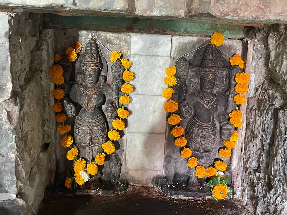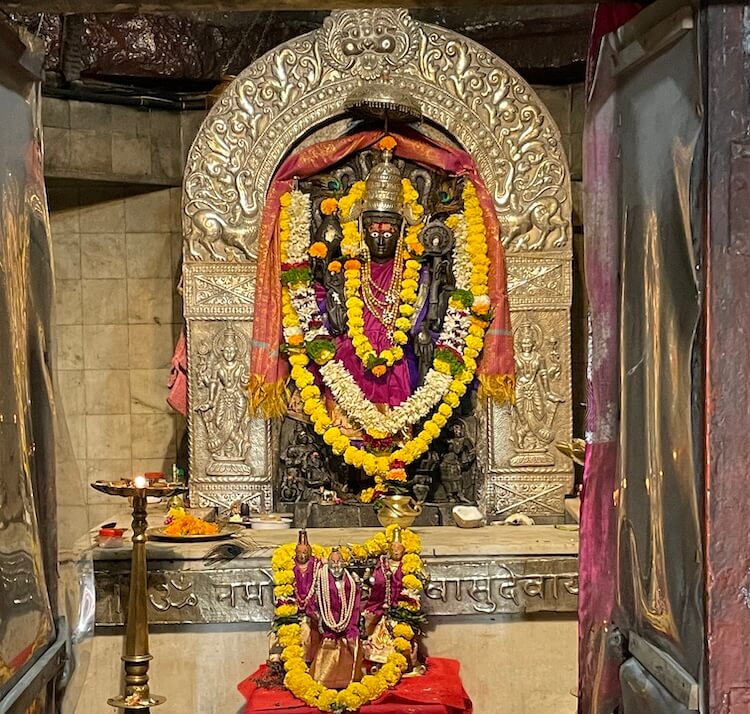 गर्भगृहात वज्रपीठावर चांदीच्या प्रभावळीत विष्णूची काळ्या पाषाणात घडवलेली मूर्ती स्थापित आहे. सुमारे चार फूट उंचीच्या या मूर्तीभोवती असलेल्या प्रभावळीत मत्स्य, कूर्म, वराह, नरसिंह, वामन, परशुराम, राम, कृष्ण, बुद्ध आणि कल्की अशा दहा अवतारांचे चित्रण आहे. चतुर्भुज विष्णूमूर्तीच्या चार हातांत शंख, चक्र, गदा आणि कमळ आहेत. मूर्तीच्या सान्निध्यात लक्ष्मी, बृहस्पती आणि नारद मुनींच्या प्रतिमा आहेत.