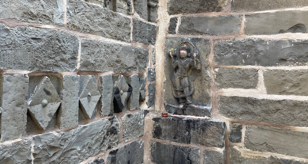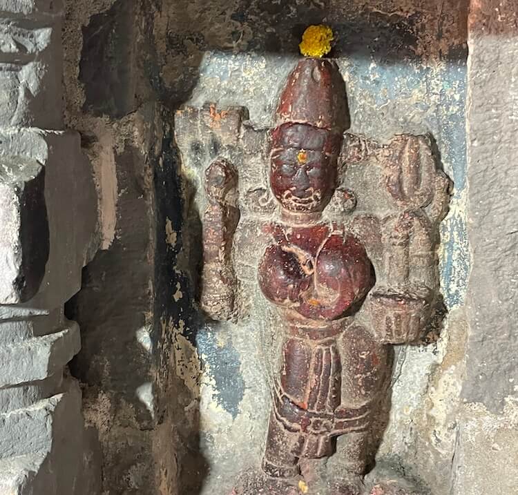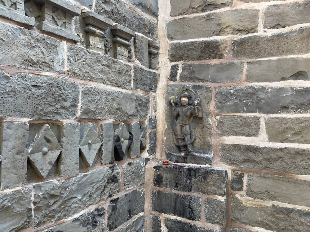 मुख्य मंदिराभोवती असलेल्या आवारभिंतीतील प्रवेशद्वारातून मंदिराच्या अर्धखुल्या स्वरूपाच्या मंडपात प्रवेश होतो. या मंडपाच्या डावीकडे ओवऱ्या व उजवीकडे सभागृहासारखी रचना आहे. मंडपात मध्यभागी चौथऱ्यावर गरुड मूर्ती आहे. सभामंडप व गर्भगृह अशी या मंदिराची रचना आहे. सभामंडपाच्या खुल्या प्रवेशद्वाराच्या दोन्ही बाजूंना कक्षासनासारखे दगडी चौथरे आहेत. सभामंडपाच्या मध्यभागी चार दगडी स्तंभ आहेत. पूर्वी या खांबांच्या मध्यभागी रंगशिळा असावी, अशी येथील रचना भासते. सभामंडपाच्या भिंतींमध्ये असलेल्या देवकोष्टकांत शिवशंकर, गणपती, ब्रह्मदेव आणि हनुमानाच्या मूर्ती आहेत. याशिवाय येथे काही प्राचीन मूर्तीही आहेत. गर्भगृहाच्या उजव्या बाजूच्या देवकोष्टकात द्वारपालांची शिल्पे आहेत.