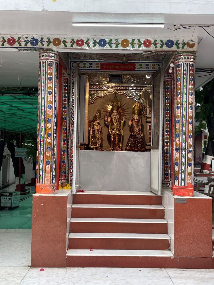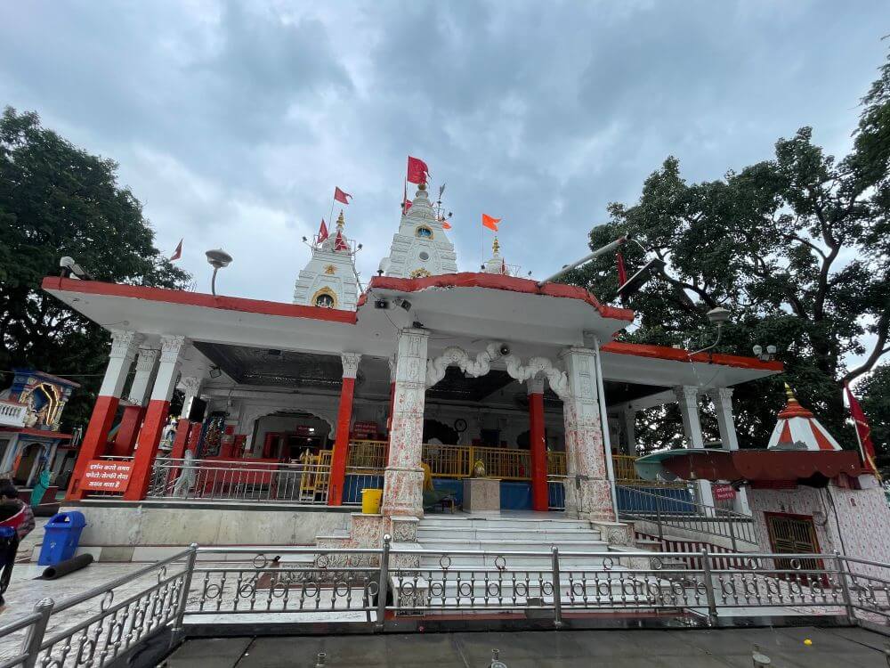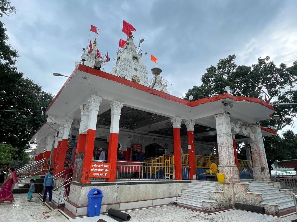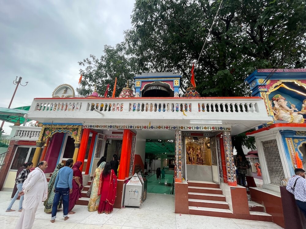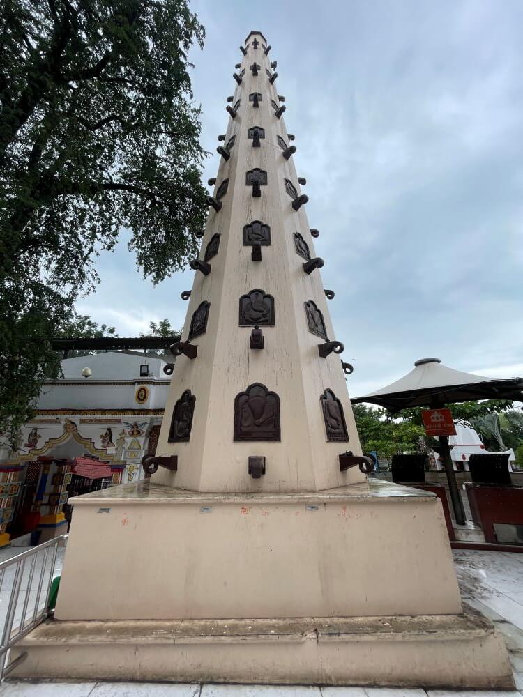 On the right side is a small shrine shaped like a sacred pot (kalash). A tall lamp tower (deepmala) rises nearby.