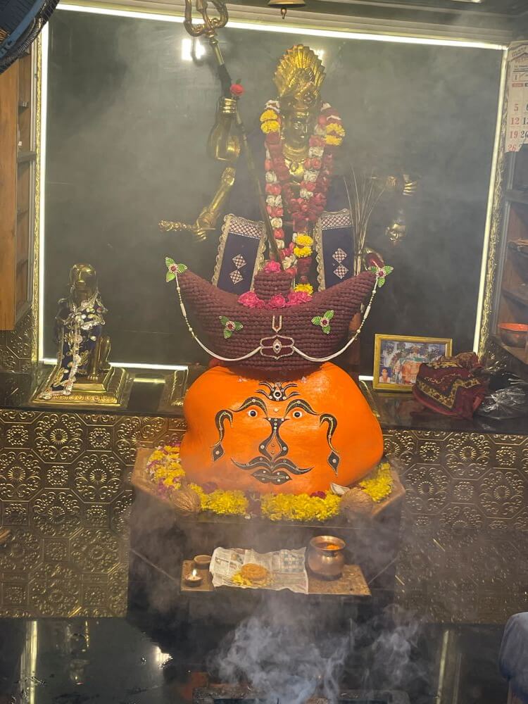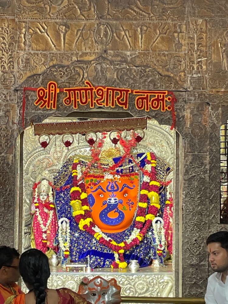 The antechamber is also open in design, with multiple arches along its walls. The pillars here feature elephant heads, with rows of elephant motifs carved into the bands above. In niches along the front walls are two large idols of Ganesha. In one, the deity is depicted slaying a demon. The temple has three sanctums – one main and two subsidiary. In the main sanctum, upon a tall pedestal, the self-manifested idol of Ganesha is enshrined in a silver-embellished shrine. Covered in vermilion, the idol has painted eyes and trunk. A small golden crown rests on its head. On either side stand the idols of Riddhi and Siddhi. Directly opposite is the silver idol of Ganesha, placed on a silver platform. In the complex, there are 33 smaller temples dedicated to Shri Ram, Shiva, Durga, Sai Baba, Hanuman and other deities.