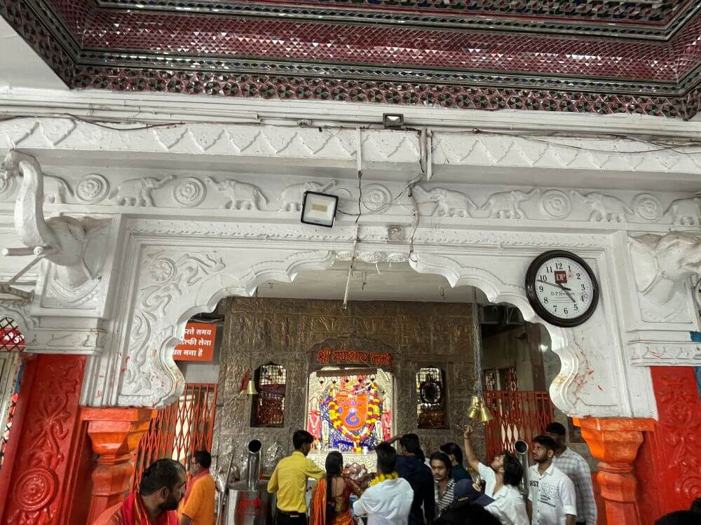 The main temple stands ahead on a raised platform. Its structure comprises a small vestibule, a large hall, an antechamber and the sanctum. Built in modern style, the temple has three spires, the central one being the tallest. All three spires are crowned with golden amalakas and kalashas. On the front of the central spire is a grand sculpture of Ganesha. The hall has stairways on both sides for entry. The open hall is supported by marble pillars, carved with intricate designs. The ceiling inside is decorated with large glass panels depicting geometric patterns, leaves and flowers. One panel even shows Radha and Krishna in a dancing pose. From the hall’s viewing queue, devotees can catch the first glimpse of Khajrana Ganesh’s idol.